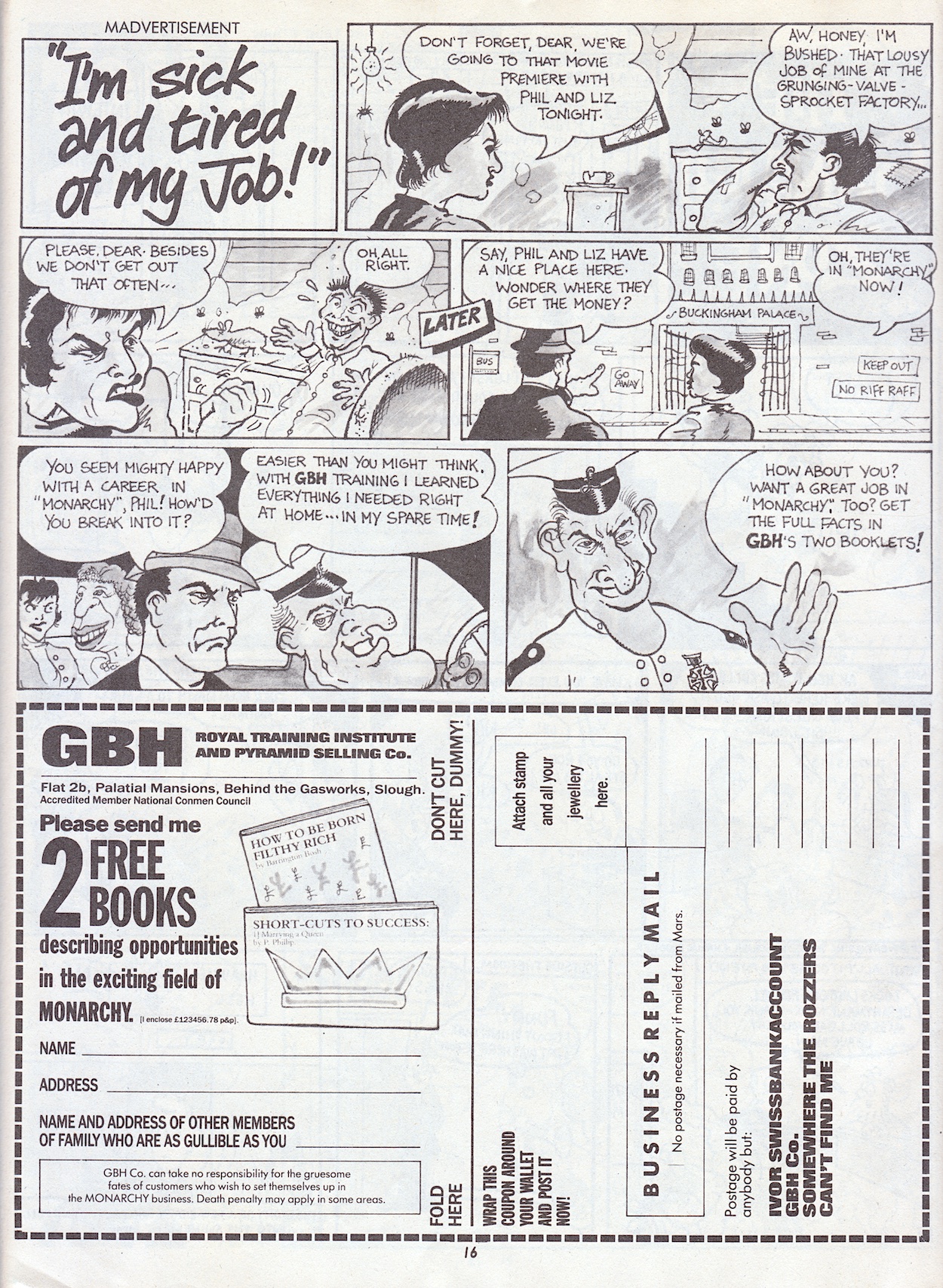 There’s the Pete and his Pimple strip I mentioned earlier, when Pete eats too many Easter Eggs and discovers his pimple’s pus takes like delicious milk chocolate. Of course it runs out just as he tries to impress Lovely Lucy. The Wonder Pig (this time called Laffie) is back in the first of a series of weekly adventures with the usual predicament, and then on Mercury a rather familiar looking royal family have summoned Burp to help with the sweltering heat on the first planet next to the sun. This leads nicely on to one of two GBH Madvertisements in this issue.