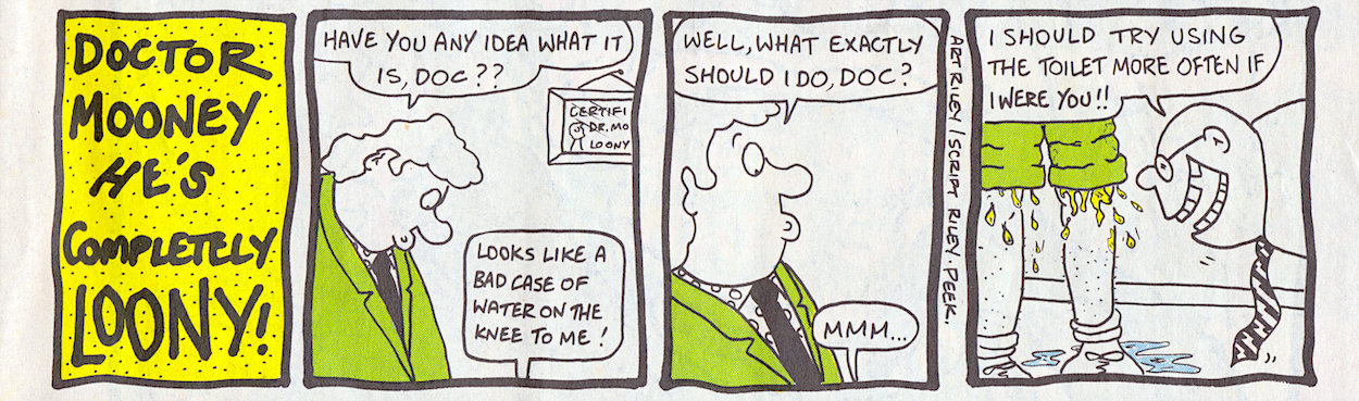 A couple of mini-strips before we round off this week’s review and Ed McHenry’s Wally of the West continues to entertain. This week it’s not Wally himself that’s acting on the silly side, he’s actually the innocent victim of someone else’s ridiculousness. Then Marc Riley’s Doctor Mooney He’s Completely Looney has two scriptwriters this week, Marc himself and Michael Peek. It’s silly, gross-out humour and one which made me chuckle because I’m still a big child.