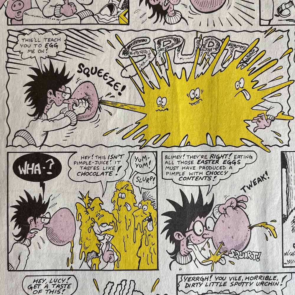 Readers were asked to send in their ideas to cure Pete’s giant unsightly pimple once and for all and, while some would do so with ideas taken from the real world, as the weeks went on they’d get more and more crazy, really showcasing the imaginations of the fans. The Slugs, the first strip of the issue, also ended with a competition although it was in place of an actual punchline unlike Pete’s, and Frank Sidebottom made a blink-and-you’ll-miss-him cameo in Ponsonby Claretthe Know-It-All Parrot’s second and sadly final appearance.