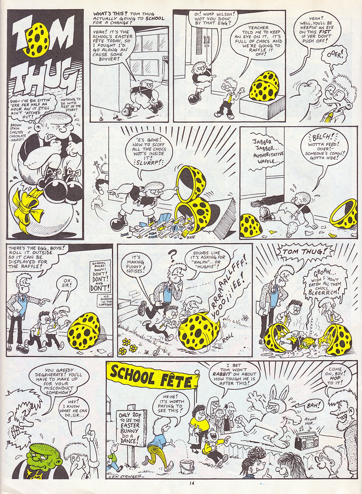 This is actually a bit of a sticking point with me as far as some modern American comics go. They can have lovely elaborate covers, yes, but they don’t always relate to the story inside. If this issue of OiNK was released today I’d swear they were taking a shot at those. Inside, it’s also the Easter issue, with Uncle Pigg chowing down on a mountain of chocolate eggs while he cracks (sorry) puns, but apart from Lew Stringer’s two strips no others shell out (sorry again) on eggy scripts. Tom Thug’s title panel also seems to follow the theme from the cover.