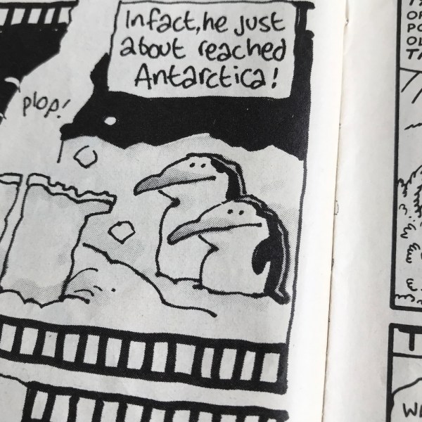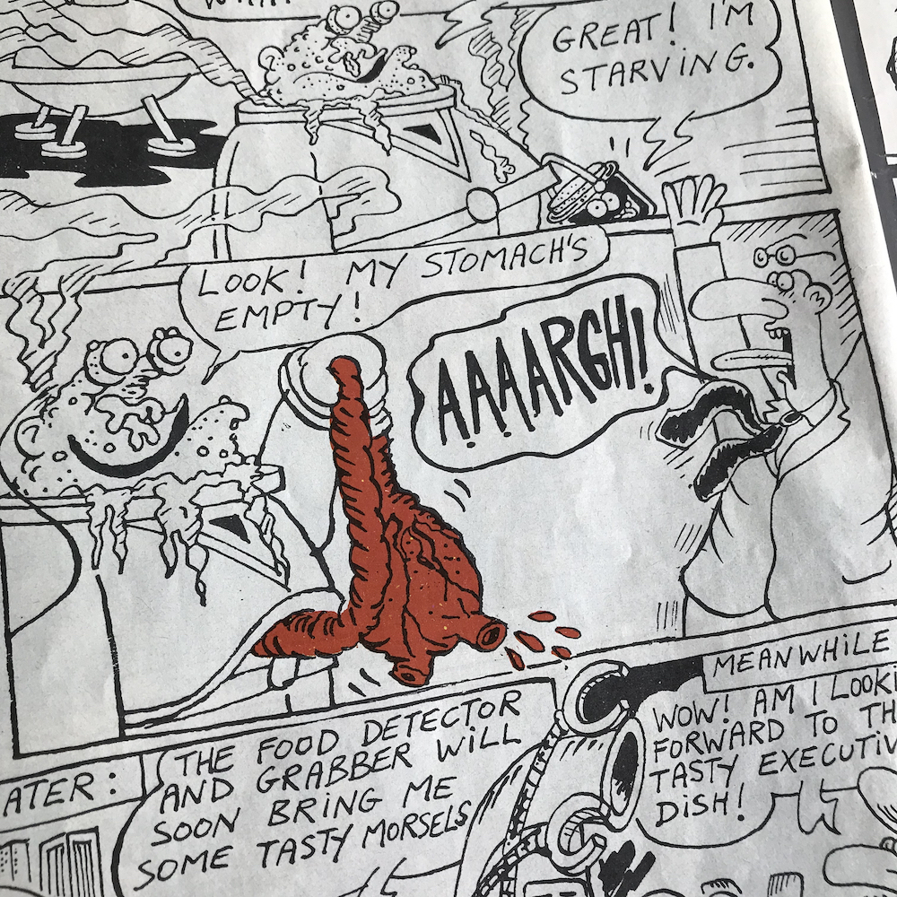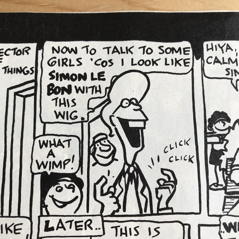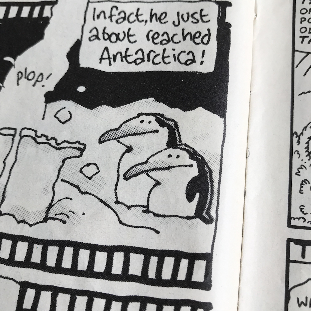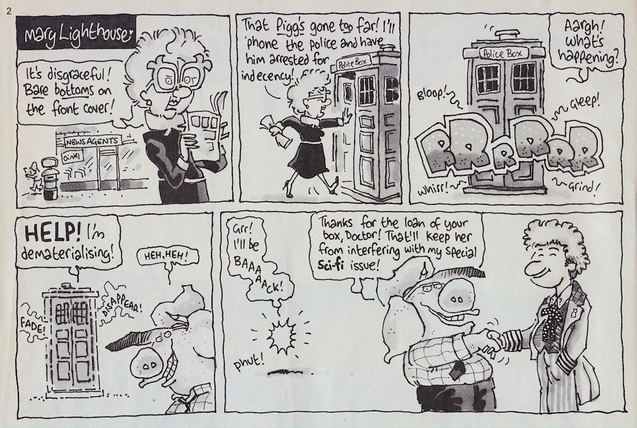 I wonder if Colin Baker ever saw himself drawn in Ian’s style? This wouldn’t be the last time The Sixth Doctor would influence Uncle Pigg but that’s a story for a future issue so you’ll just have to be patient. Mary’s TARDIS pops up on the Grunts page as she desperately tries to phone the operator before reappearing in her own strip near the end of the comic. But she wasn’t the only character to materialise throughout the issue.