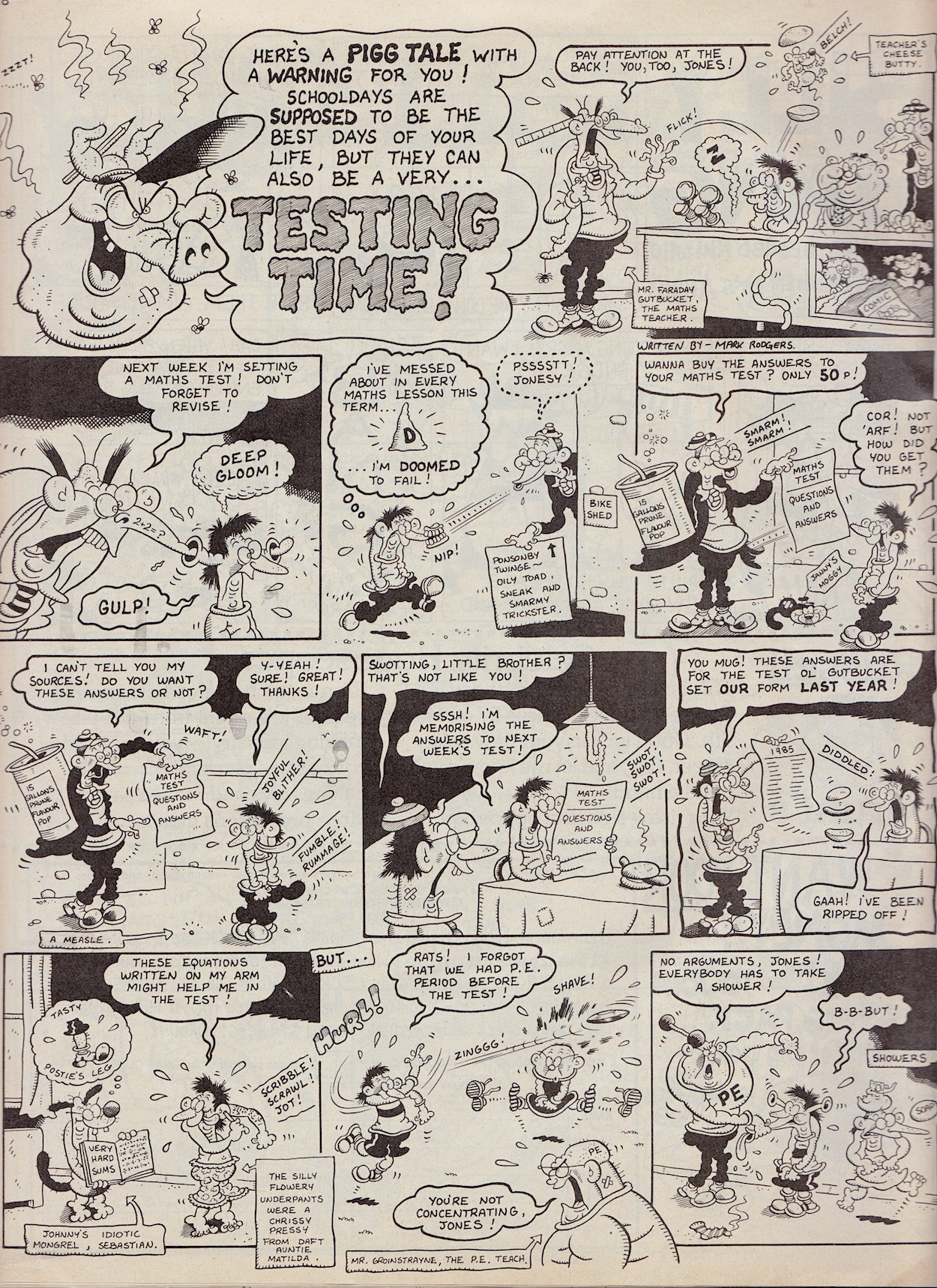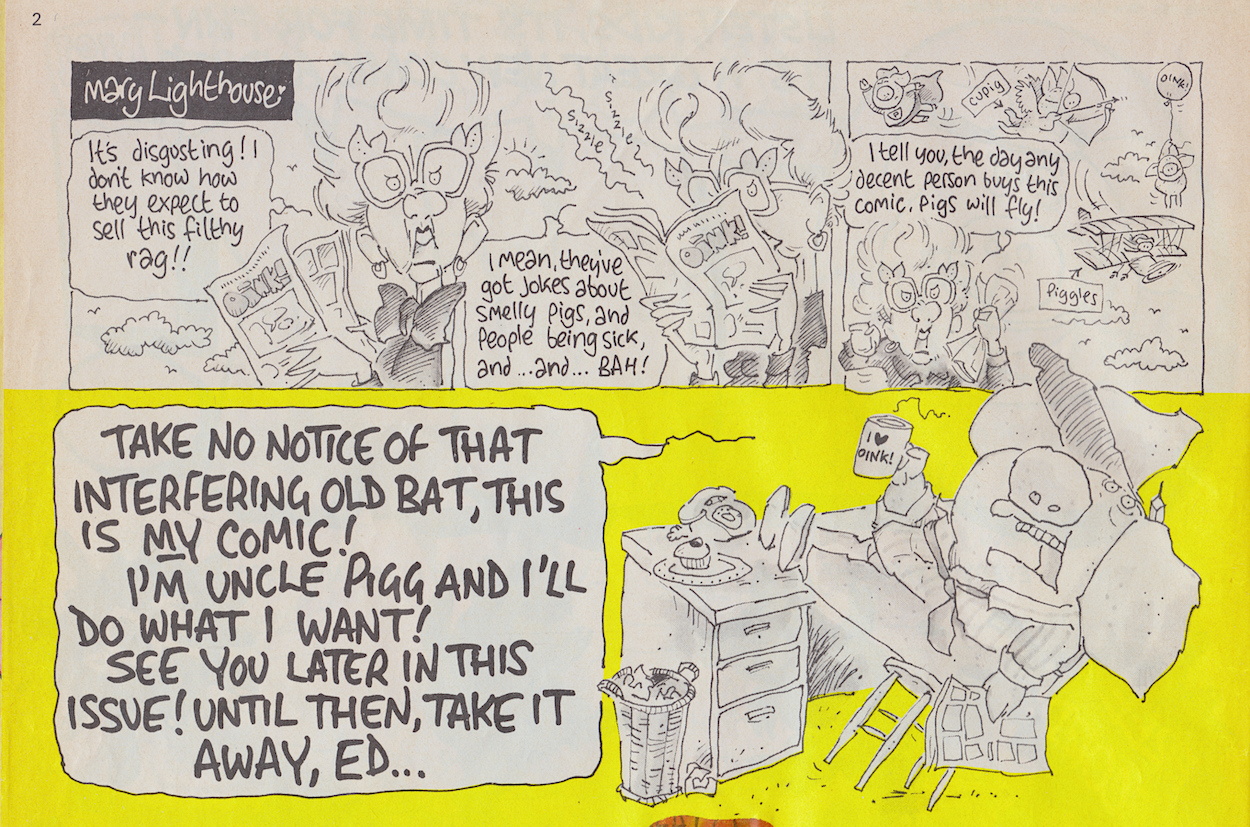 This is the first of the themed editions, which over the course of the majority of the fortnightly issues would include everything from traditional Hallowe’en and Christmas themes to music, health, families, war, revenge, love… the list goes on. It added another original element to OiNK and made each individual issue a unique experience. In the early issues editor Uncle Pigg and critic Mary Lighthouse would often introduce the theme, mostly written by Mark Rodgers and drawn by Ian Jackson.