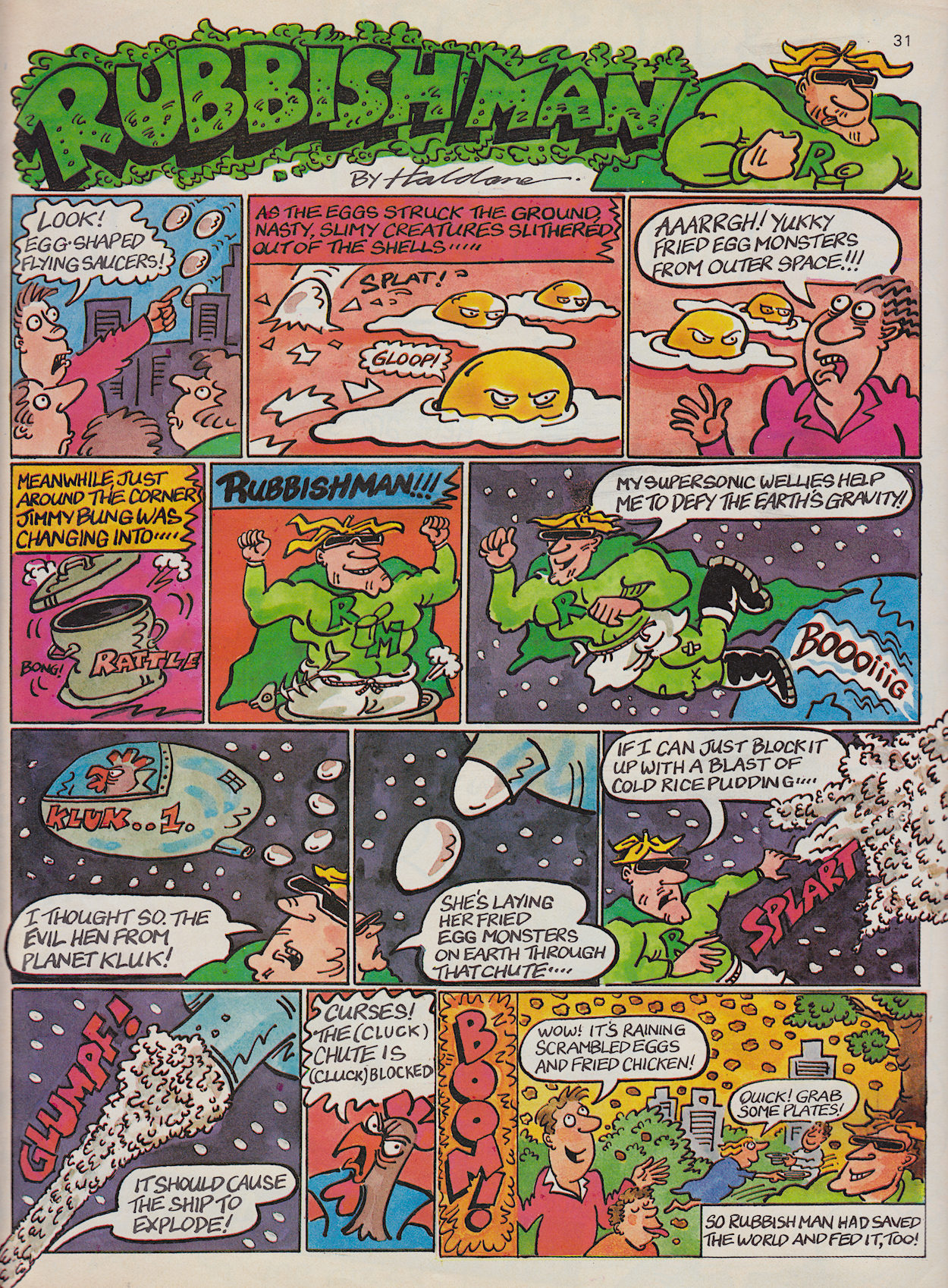 Our cast is made up of Mark Rodgers as Captain Slog, Patrick Gallagher as Sock, Marc Riley as Jock and Tony Husband under the chicken mask as the alien, Jerm. Can you imagine the fun these guys had creating this? Imagine this being part of your job! Jerm would make his escape and pop up in various other strips, a few examples of which I’ve included below.
