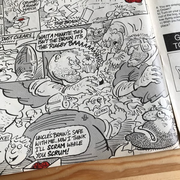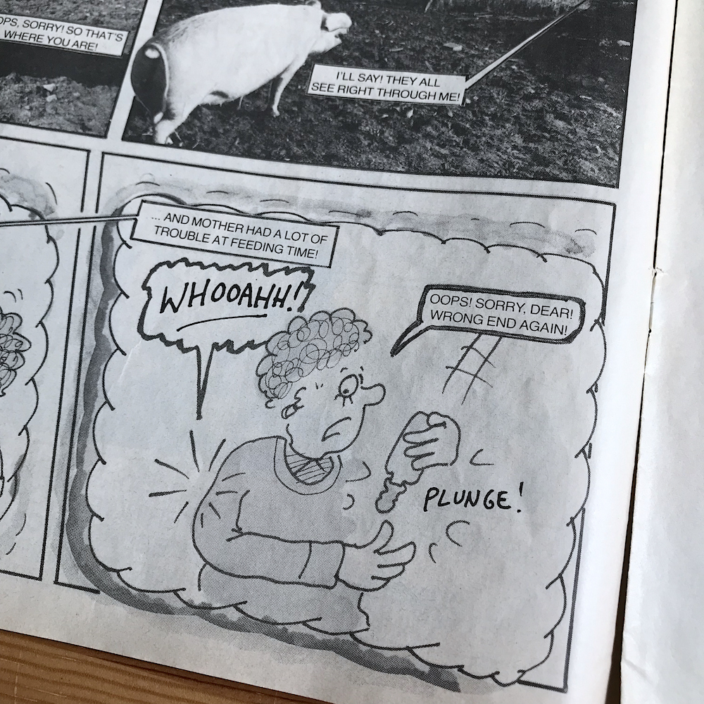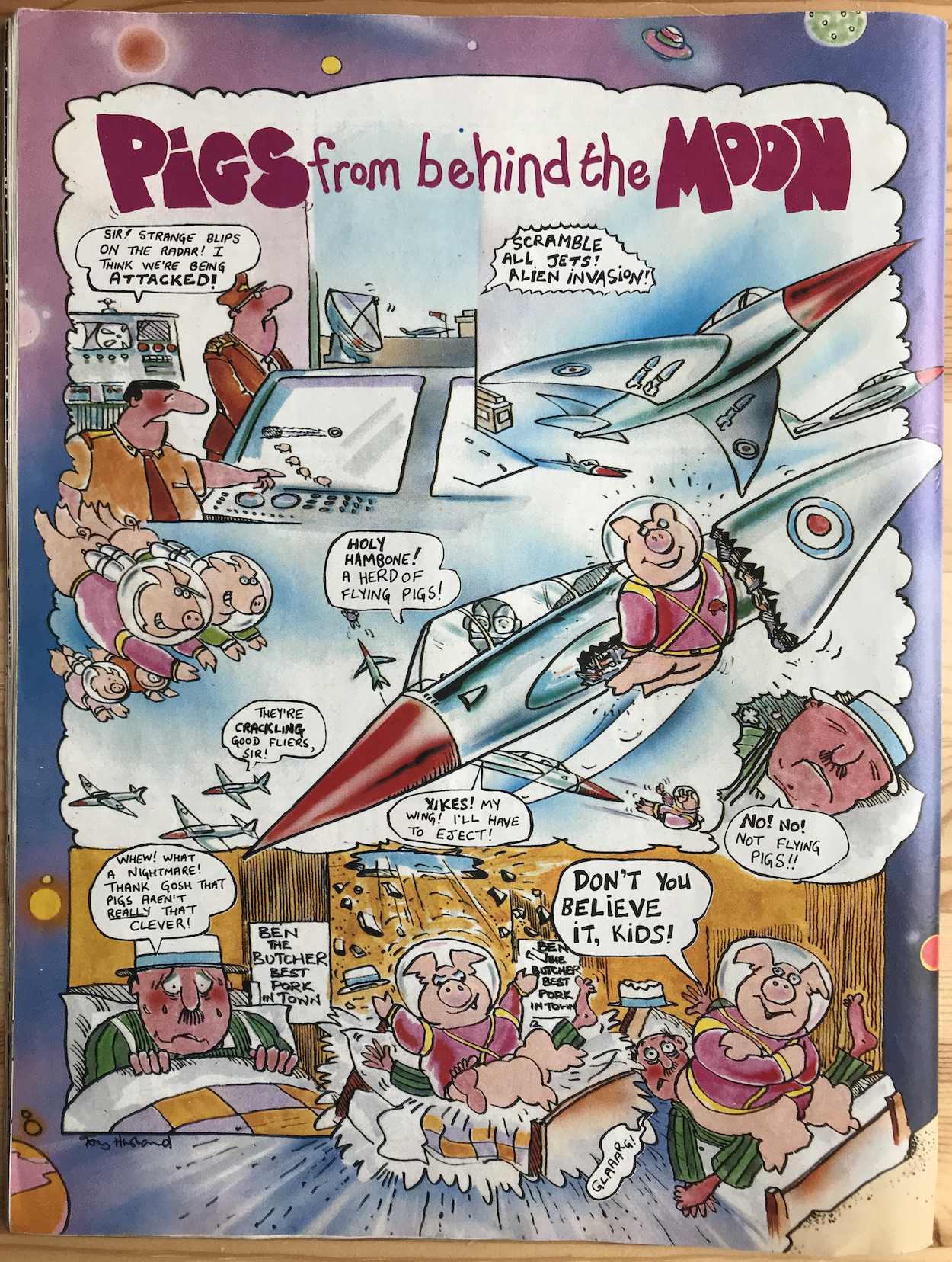 It’s just one very happy memory I associate with this comic and I’ll share more as we go along. My nanny’s giggle was completely justified with Tony Husband‘s cover and its bare piggy bottoms, which actually wraps around to the back page and its explanation for the image. I always loved a good wraparound cover on a comic. Marvel UK were very good at them and while this one isn’t advertised as such (the poster mentioned on the cover refers to a Star Wars spoof inside) it would make for a funny addition to the wall.
