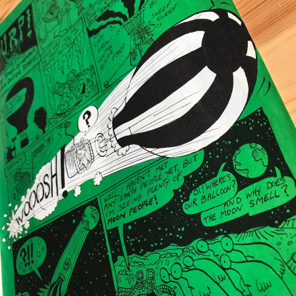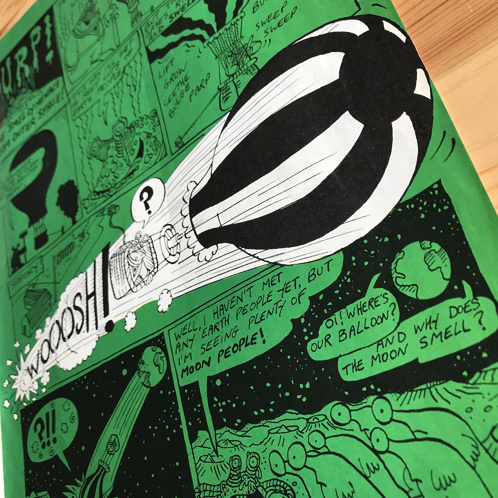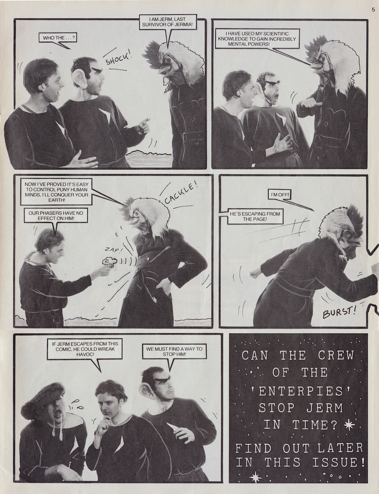Speaking of which, we’ve made it to the last page so it’s time to rein in Jerm once and for all as we conclude the first outing for the crew of the Enterpies with Star Truck: The Final Chapter. What I love the most here is the fact they’re self-aware of being inside the pages of a comic. From the reference to it being on page 31, to the shortcut through the staples taken by the Captain and his men, the daftness doesn’t let up for one panel. Check out the cardboard tube/tennis racquet gun, elaborated upon with some quick hand drawn lines.