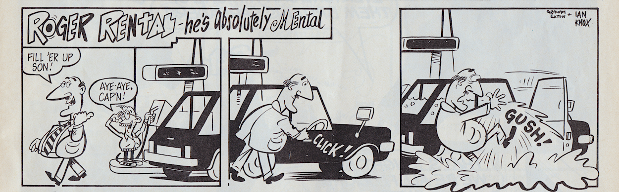 First though, prolific IPC Magazines comics writer Graham Exton was also part of the creative team behind OiNK and contributed many stories and countless amounts of puns. The first full strip of his I’m showing is the first appearance of regular nutball Roger Rental, He’s Completely Mental, as drawn by local Northern Ireland artist Ian Knox.