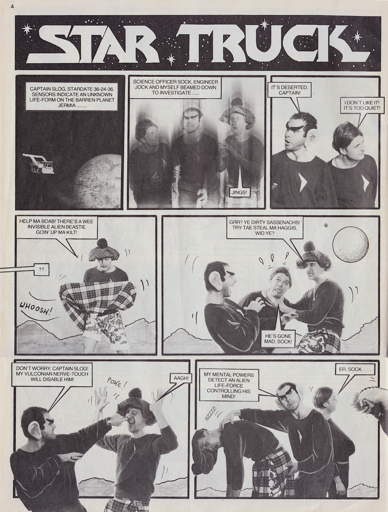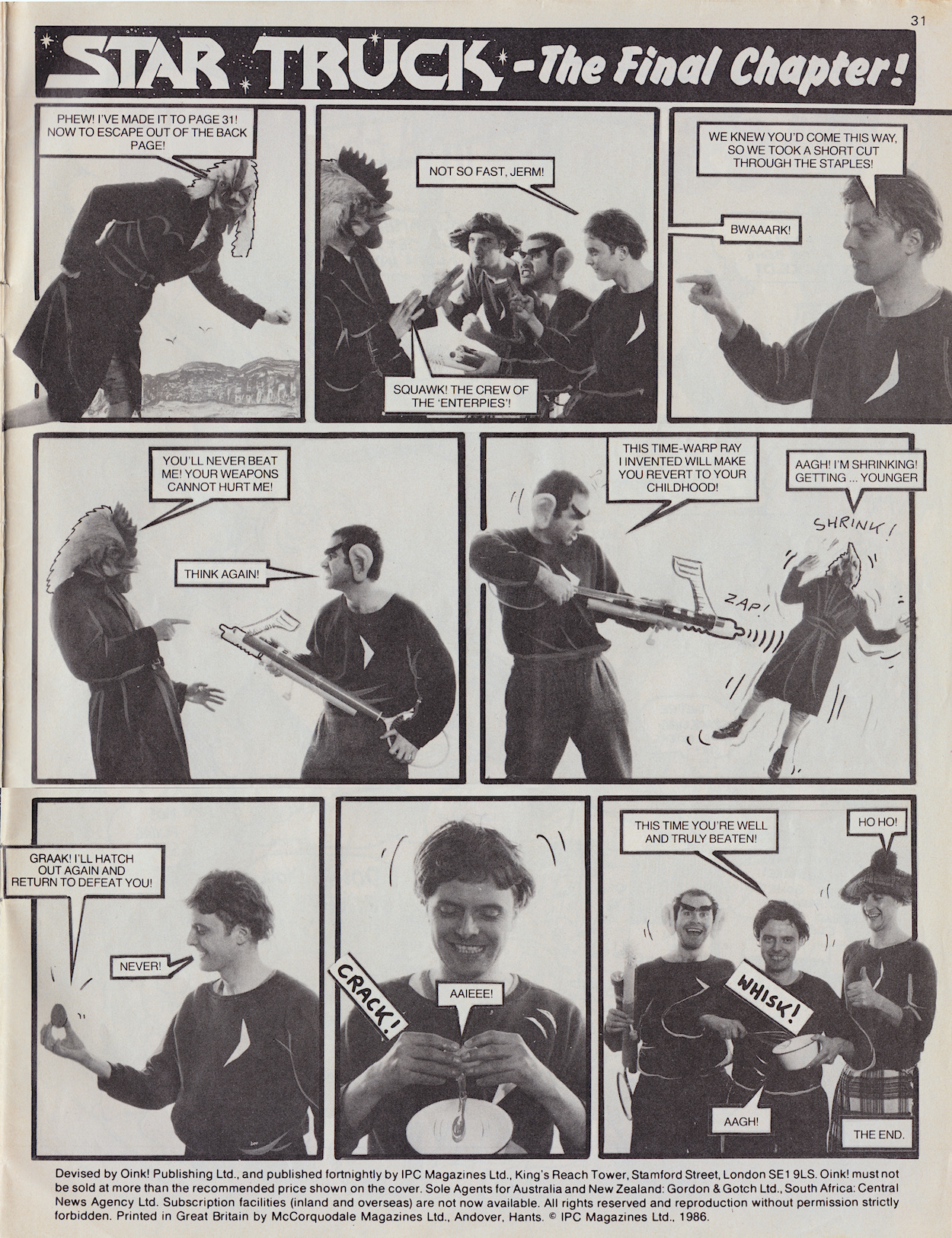 Next up is undoubtedly the star strip of the issue. Boldly going where no photo story had gone before, the OiNK team were really pushing the boundaries of what they could achieve with the format, the characters literally bursting out of the panels and running amok throughout the comic. My original exposure to Star Truck was with the sequel story in the first OiNK Book, which was even more chaotic! Here, in only the third issue, the imagination of the OiNK team is on full display.