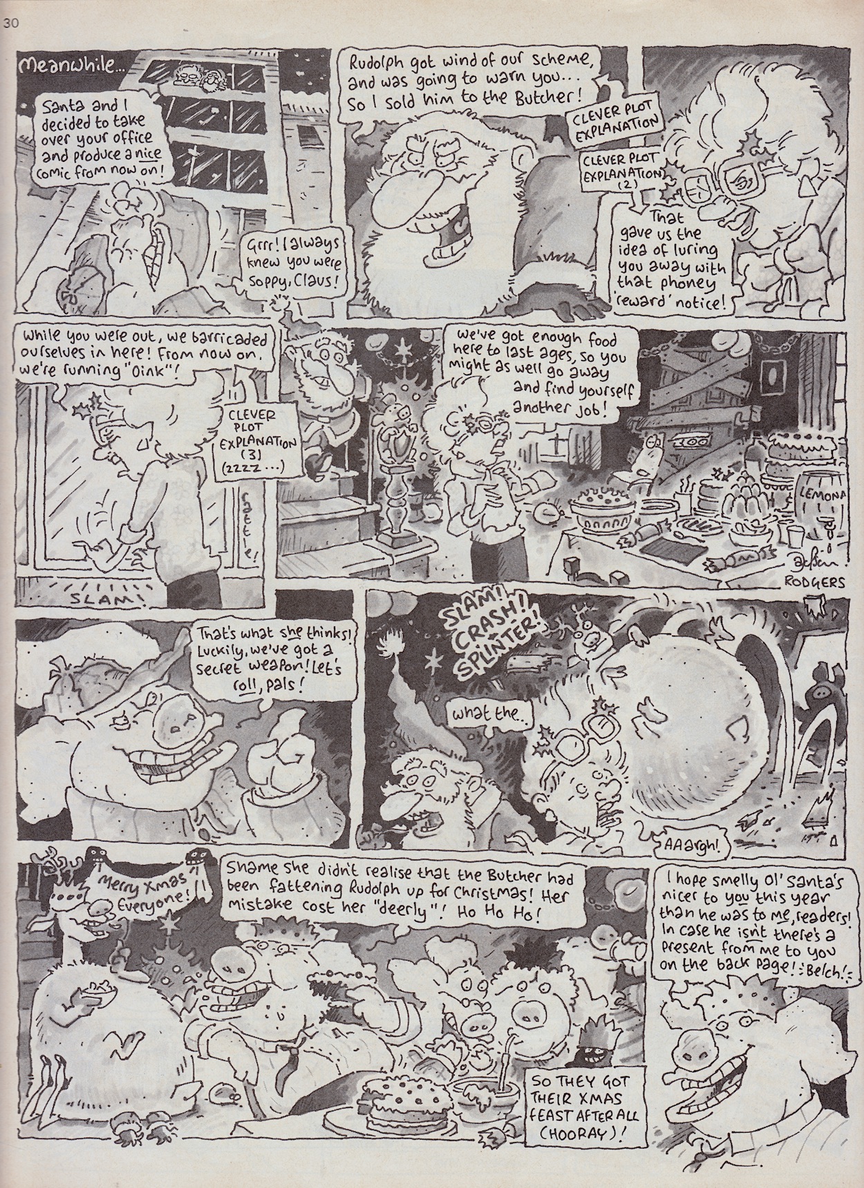 It’s a simple story and all of these fan favourite characters are reduced to one gag each as the aliens examine them, which was a shame when the arrival of a new issue of OiNK was such an event after it ended. However, I do like Dead Fred‘s ever-so-polite response and I genuinely laughed out loud at the plummeting spaceship making such an anti-climatic crash landing! Uncle Pigg is the real star here and is always entertaining, although as a kid I was gutted to see him back on the sand and raking in the cash like we’ve seen him before but with no mention of any future OiNKs.
