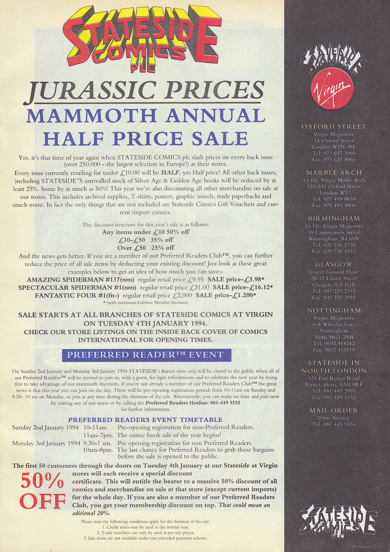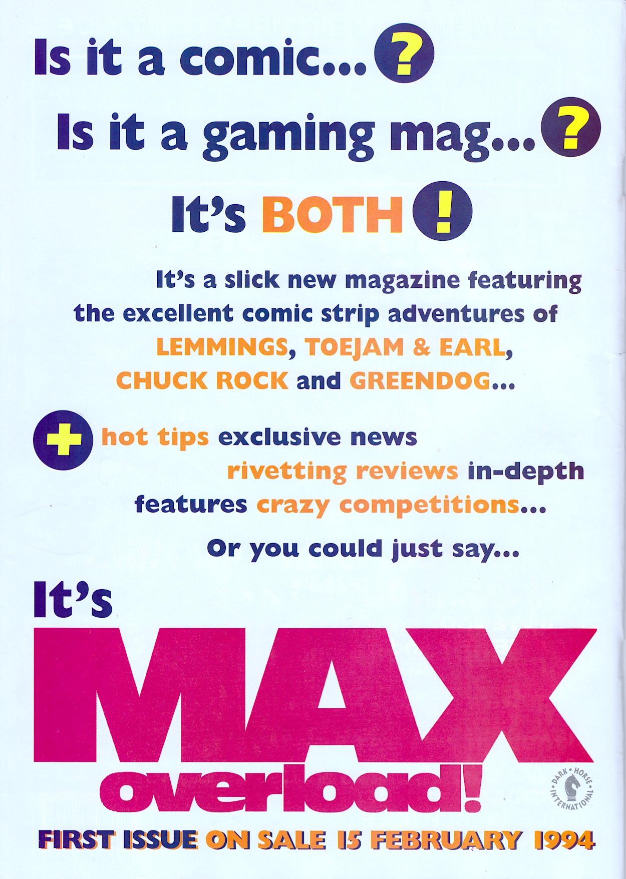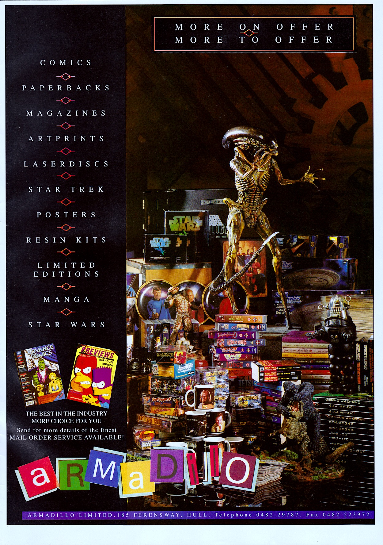 I loved my computer games magazines (in particular Commodore Format and GamesMaster) but the idea of something like that with lots of comic strips in it felt like a gimmick. Although I wasn’t sure if the gimmick was comic strips in a gaming magazine, or gaming features in a comic; it sounded confused. Elsewhere, a chain of comic shops uses a painfully strenuous link to the comic to justify its advert, and a comics and sci-fi merchandise shop I’ve never heard of takes the inside back cover. It’s rather quaint seeing these now, what with comic shops being so much more prevalent today, but back then mail order was much more necessary.