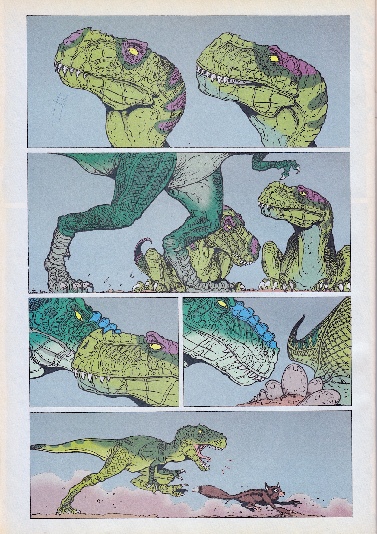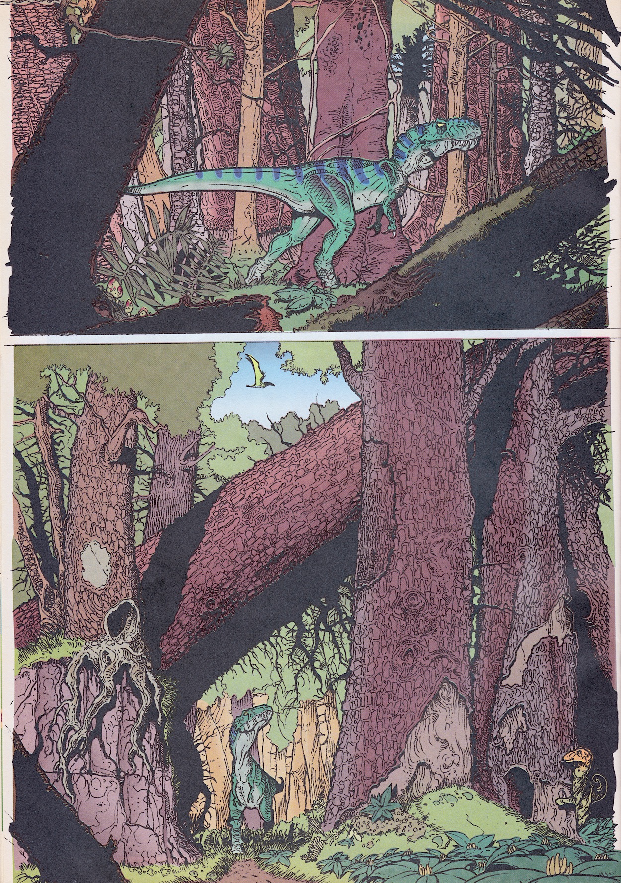 This instalment ends with the Deinonychuses sneaking into the nest at night and stealing all of those eggs, but the adolescent awakes and raises the alarm. Giving chase, our male closes in on them as they dart through the forest, but eventually the smaller, more agile dinos leap across a chasm and escape, the T.rex left roaring into the night. I remember roughly how this develops and it’s well worth sticking around for. Brilliant, beautiful stuff.