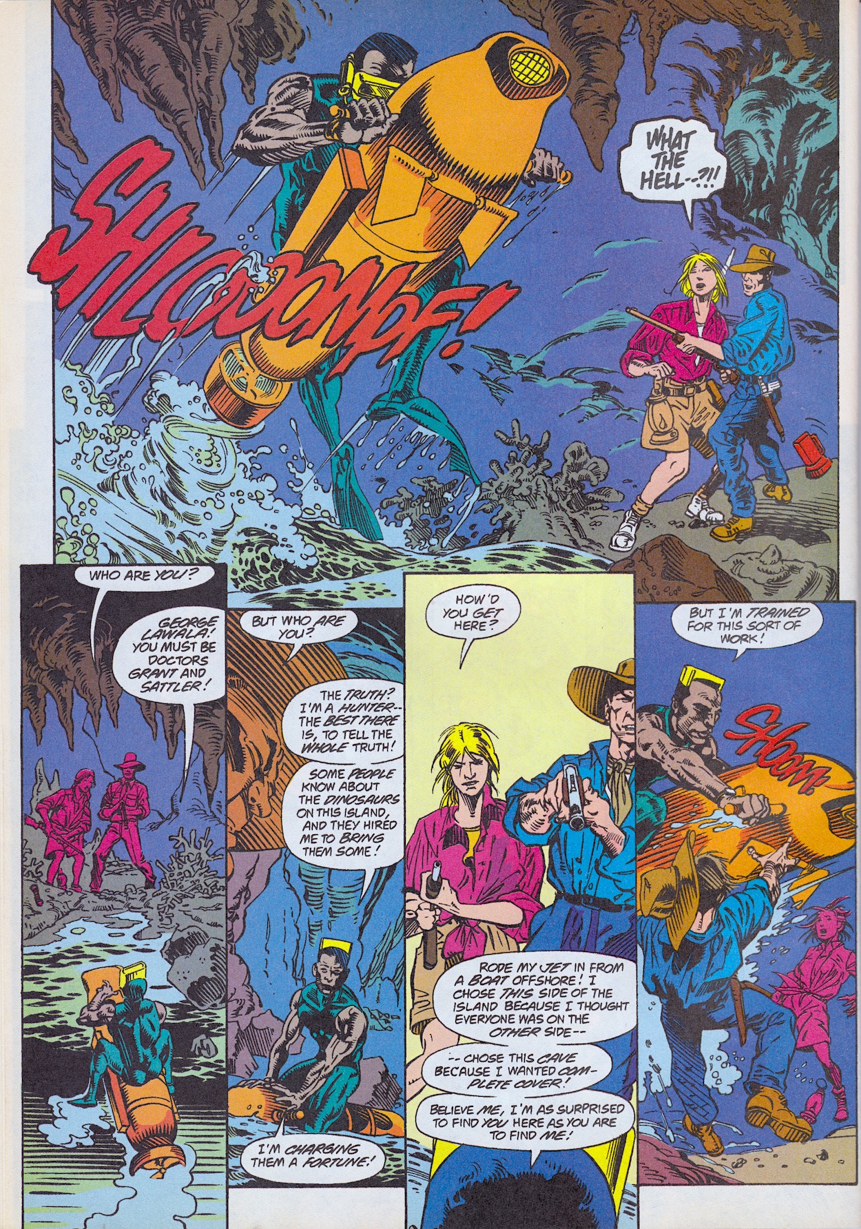 In the second part of the first official follow-up to the film, as InGen attempt to recapture all the dinosaurs they ignore Dr Alan Grant‘s warnings that there are more Velociraptors out in the wild, so Alan and Dr Ellie Satler decide to take things into their own hands. They head for the other side of the island, scientific reasoning given for every step they take in tracking the animals. They end up on a beach searching caves and in the background a little boat putt-putts along the coast in some scenic panels by penciller Armando Gill and inker Dell Barras (Samsona, Conan the Barbarian, Batman) who criminally wasn’t mentioned in the previous issue’s credits. This is a shame because his deep blacks and line work bring a real sense of action amid a gritty, realistic atmosphere.