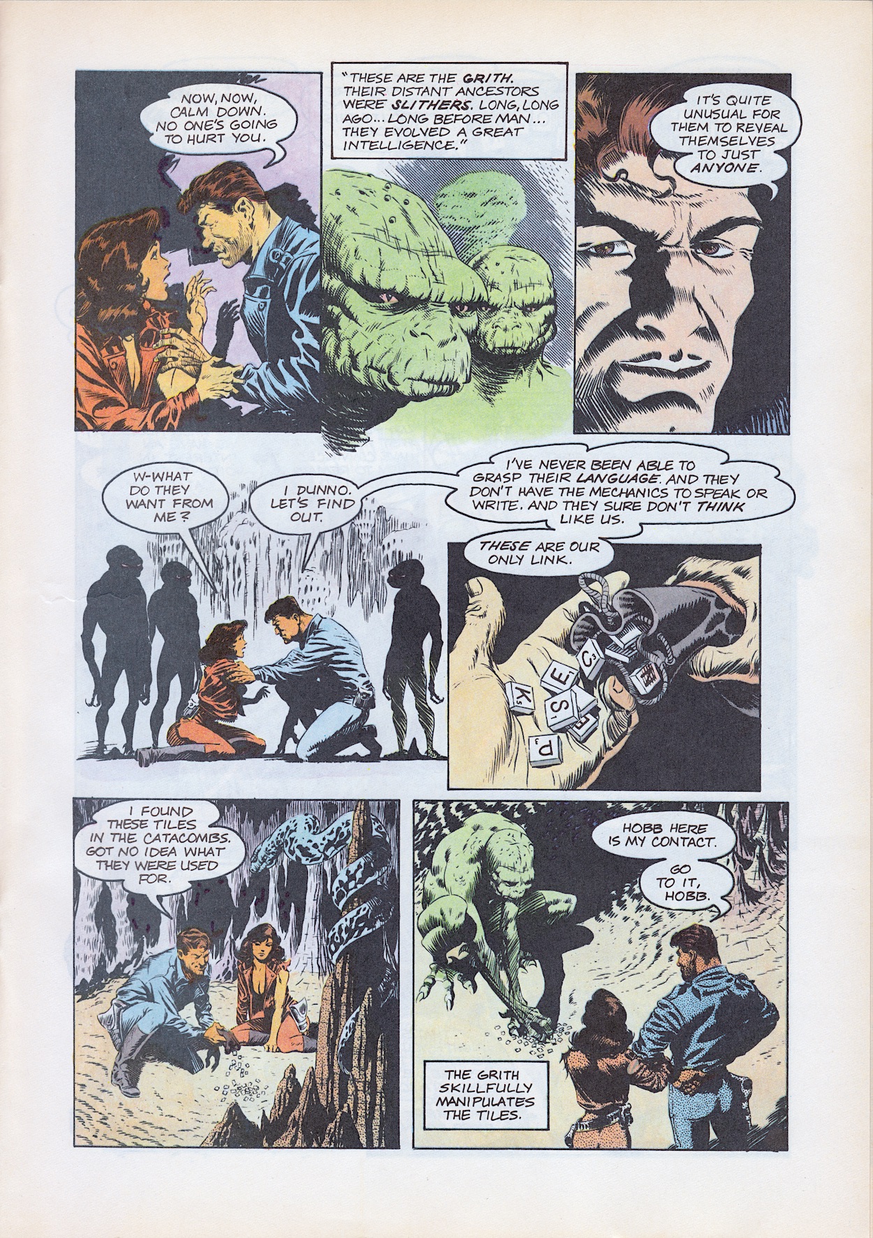 Mark Schultz‘s Xenozoic Tales is next up and it’s the second half of the story from last time. The mysterious lizard people that appeared to be kidnapping Hannah Dundee are revealed to be The Grith, a race of people who work with the Earth to grow both their own health and that of the planet. Despite correctly identifying humans as fighting against the Earth, Jack Tenrec was able to befriend them, communicating through a system of ancient tiles, the meaning of which have been lost to time. They might seem familiar to the reader though.