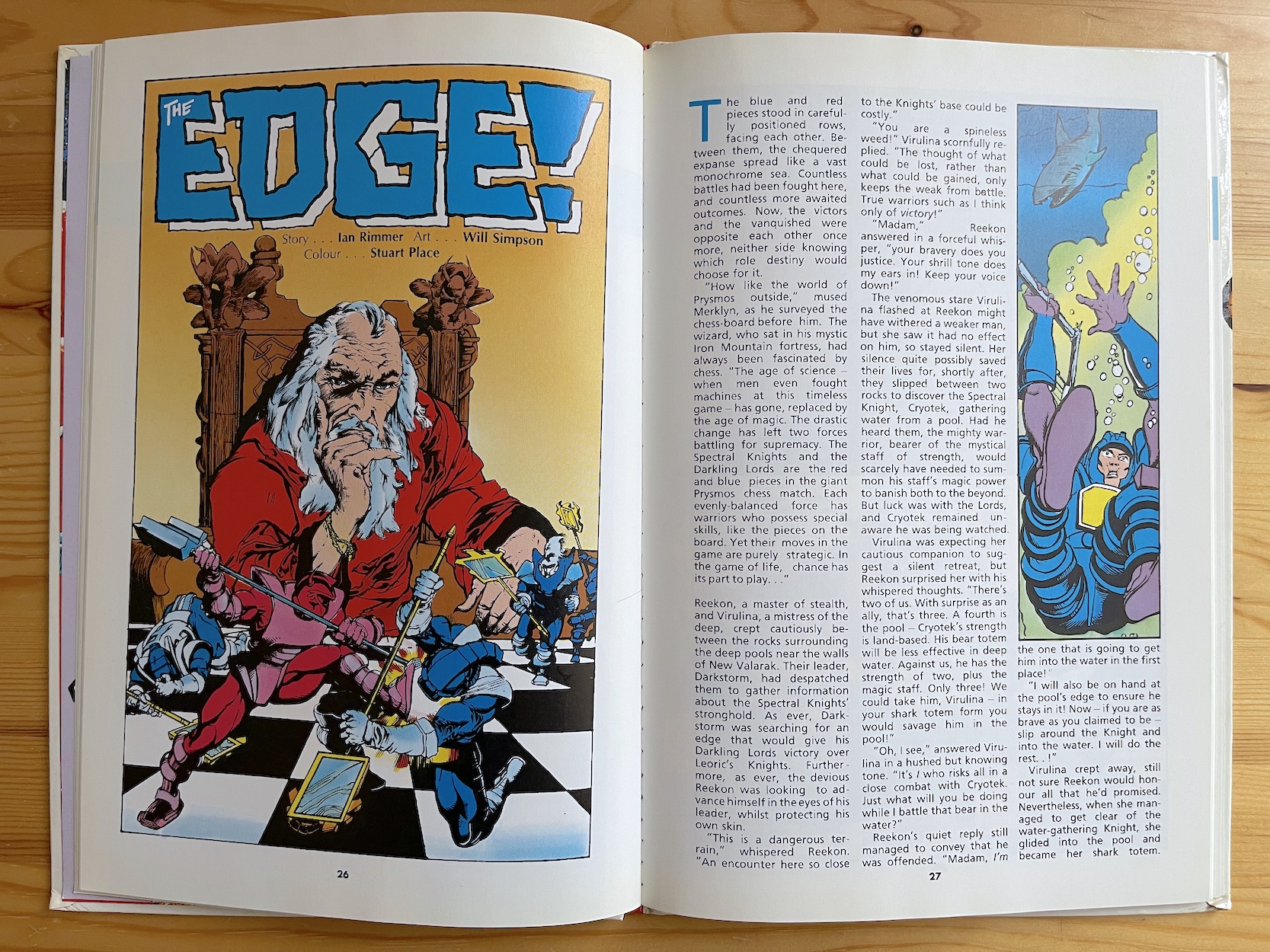 The story is bookended with Merklynn playing a game of chess, or whatever the Prysmos equivalent is, and equating his game to the ongoing battles between the two factions of warriors he’s created. The theme here is luck; no matter the strategy in the game chance will always play a part. The story itself is simple but fun and these bookends are an attempt to make it all feel more substantial than it actually is. It’s an interesting way of doing it and a good example of the more experimental writing techniques used in the text stories.