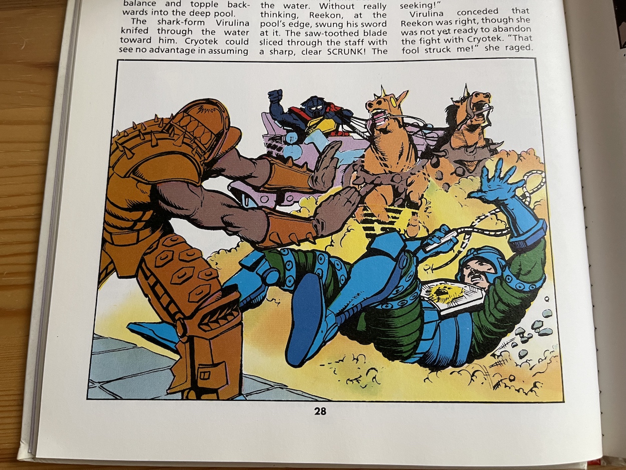 The Lords launch a mass attack in which their targets aren’t the Knights themselves but their staffs, and they begin destroying them one by one. Surely a risky manoeuvre since their own staffs would be just as vulnerable, surely? Cryotek is holding the two pieces of his and needs a free hand to fight, so he holds them together in one hand at the point where they snapped apart. The magical energy returns, all it needed was to be held together and connected via the inner energy of the person whose persona is embodied within it. The battle ends in a draw and we read about Merkylnn resetting his chess game ready for the next battle and laughing.