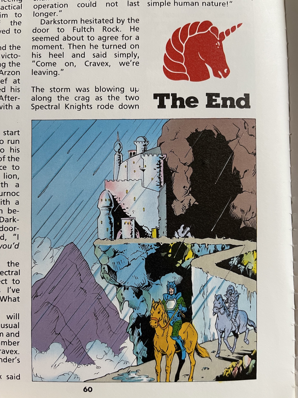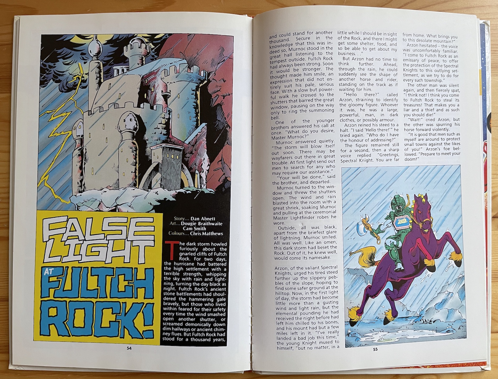 It tells the story of the Knights and Lords travelling to townships offering protection in this new dangerous age and Arzon’s next stop is Fulch Rock where the Order of the Lightfinders have taken refuge, led by Murnoc. Before he can get inside he’s set upon by Darkstorm and Cravex, barely escaping thanks to his Power of Knowledge spell poem, with which he’s able to predict the most likely next attack from his foes. However, he eventually falls over the cliff, transforming into his eagle form at the last second, slowing his decent enough to survive although he’s badly injured. He’s found by the Lightfinders and brought inside, where Darkstorm is ordered not to harm Murnoc’s guest while he works out which side to accept protection from.