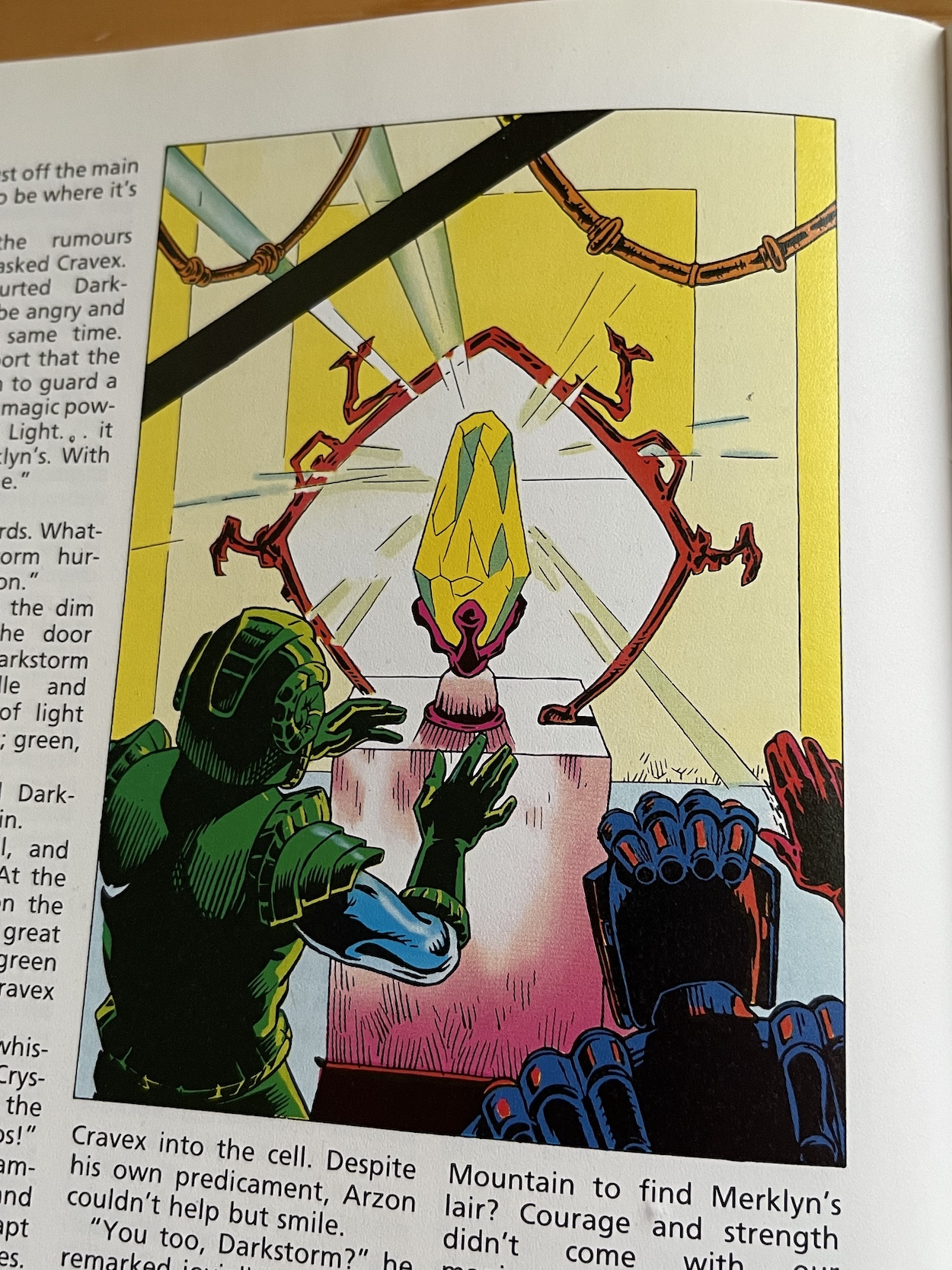 It’s a great start. The rest of the story explains how the Lords are only offering protection because of the rumour of a Crystal of Light much like Merklynn’s hidden inside. There’s some cracking dialogue here which we’ve come to expect from Marvel UK text stories and in the end we find out it’s all been a ruse to lure the Lords there to steal their armour, what these religious nuts call “Aftertech” and view as their salvation, to power themselves and take over the land. The crystal is a fake and the three Visionaries must work together to escape due to the vast numbers of followers Murnoc has amassed.