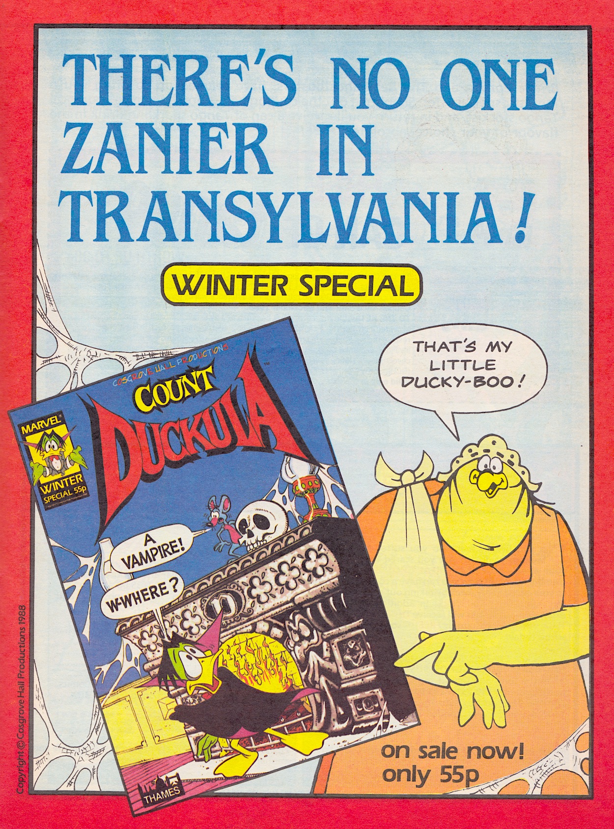 Last week I mentioned how I might just have to add the Marvel Bumper Comic to the blog’s list of real time read throughs after I found out Count Duckula had joined its ranks. In this week’s comics he also stars in an advert for his own Winter Special. Even though Duckula was a British cartoon it was Marvel US’ imprint Star Comics that produced a strip instead. In his natural home there was no regular comic with original UK content, just imports of the American strips into specials and the Bumper Comic. Surely a missed opportunity, especially given how funny the UK writing team for the Ghostbusters could be.