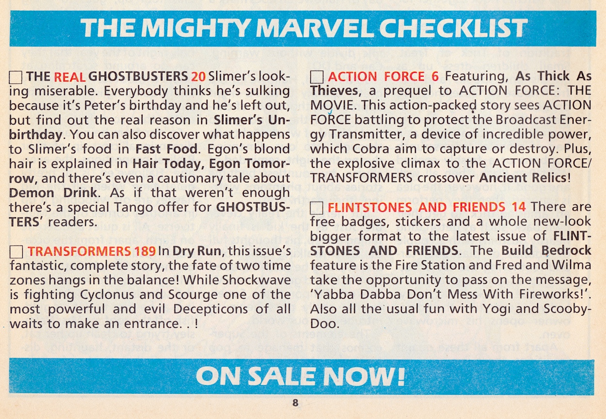 It may only be the end of August but it was already the start of the Marvel Annuals hype season on the back cover of Transformers. Strangely, while the annual would be mentioned a couple of times on the editorial and letters pages (and given away in a competition closer to Christmas) this was the only time this advert appeared in the pages of Transformers! It did appear several times in The Real Ghostbusters though. The countdown to the best time of the year had begun!