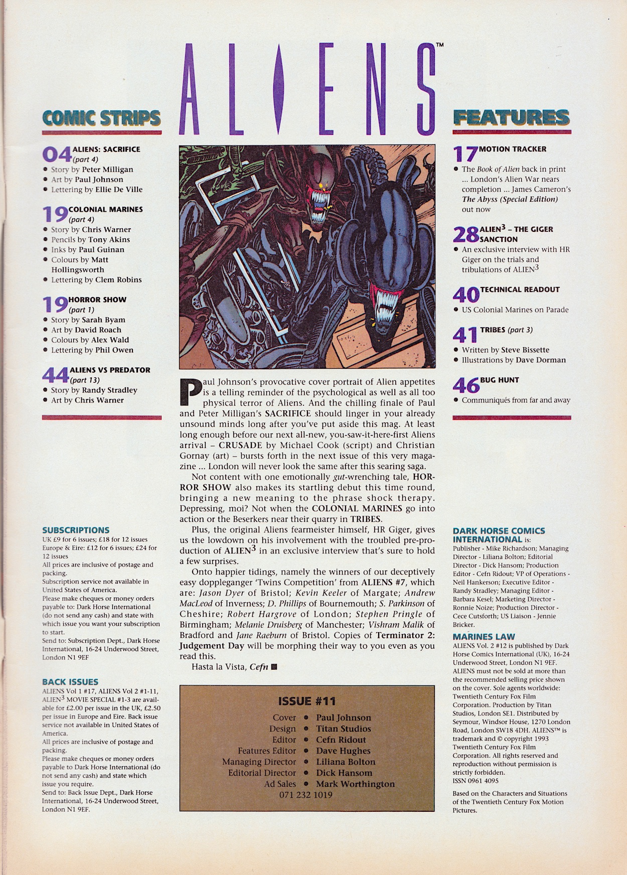 The UK exclusive strip Crusade picks up after the war but very little background is given to us. Editor Cefn Ridout seems to assume everyone knows about it already. A recap would’ve made all the difference, especially as sales were climbing with new readers coming on board. “As if the opening of London’s own Alien War in August weren’t enough” for Aliens fans? Ah the 90s, when our comics seemed to forget there were readers outside England. The editorial above shows you all the credits for the issue and then we’re launched into 12 pages of Crusade.