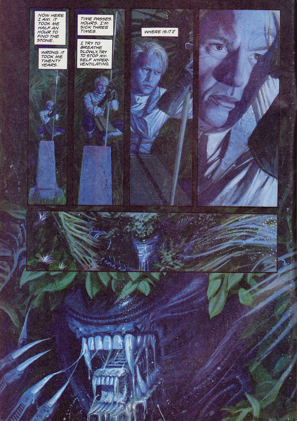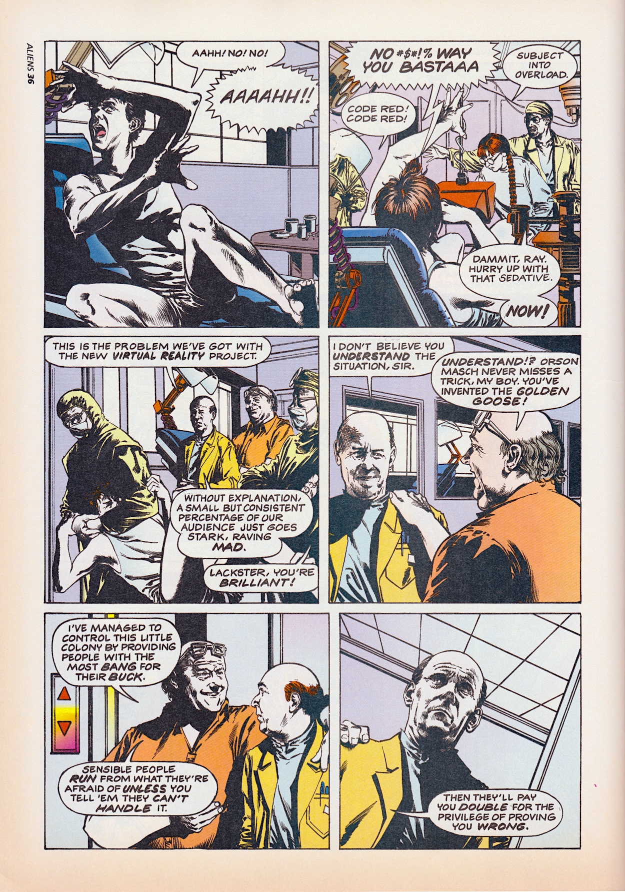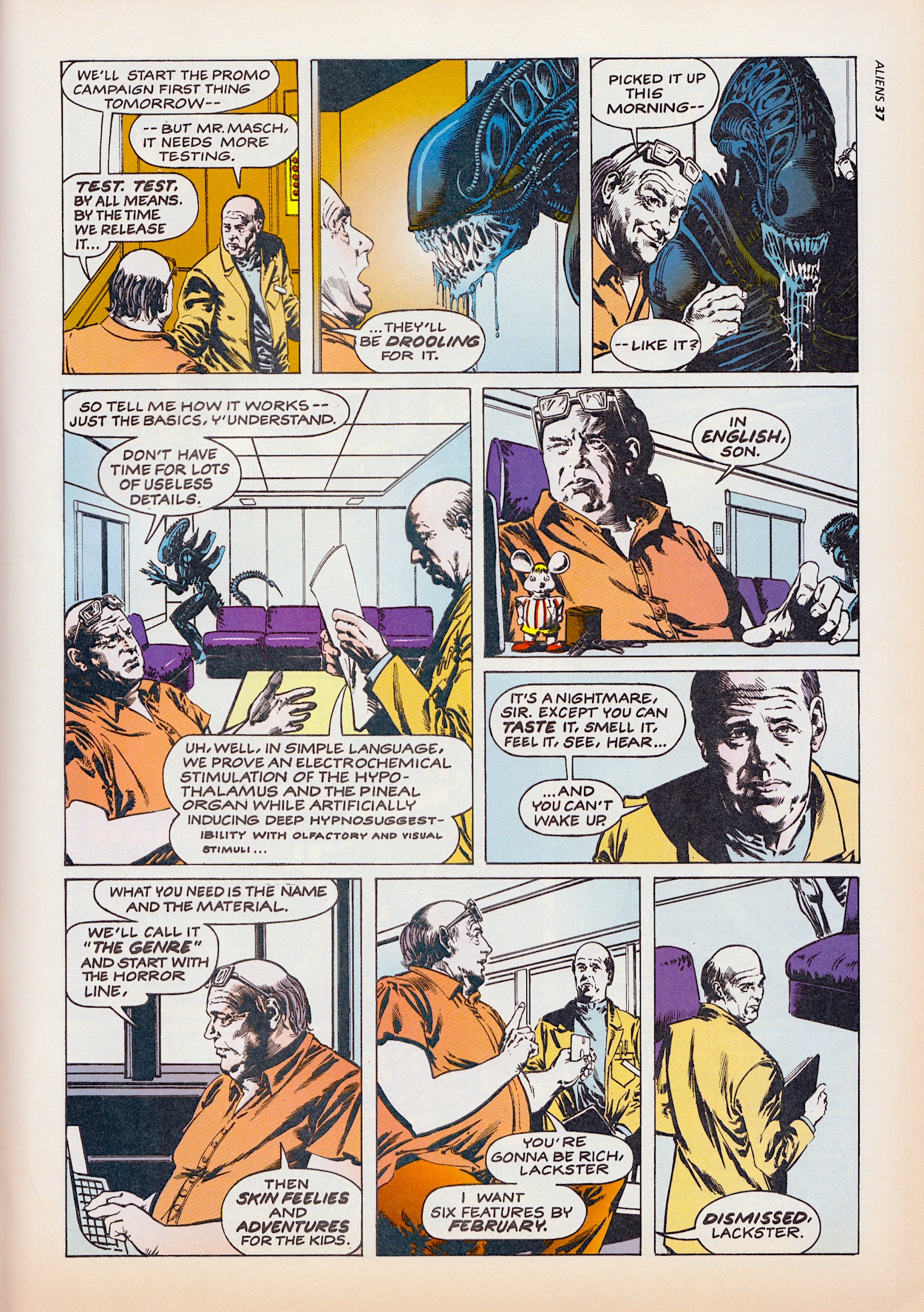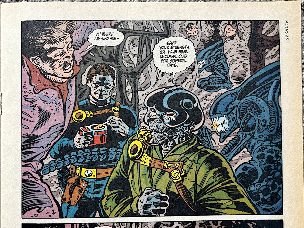 This is interesting but unfortunately its reveal towards the end of the strip is spoiled by the recap of what happened last month telling us. Confusingly, one of the volunteers is also called Hicks (it’s not him) and two pages are printed in the wrong order. One of the doctors is sexually abusing the sleeping volunteers, while in their dreams it’s the aliens claws that are all over them. It’s a particularly creepy moment but not much else occurs.