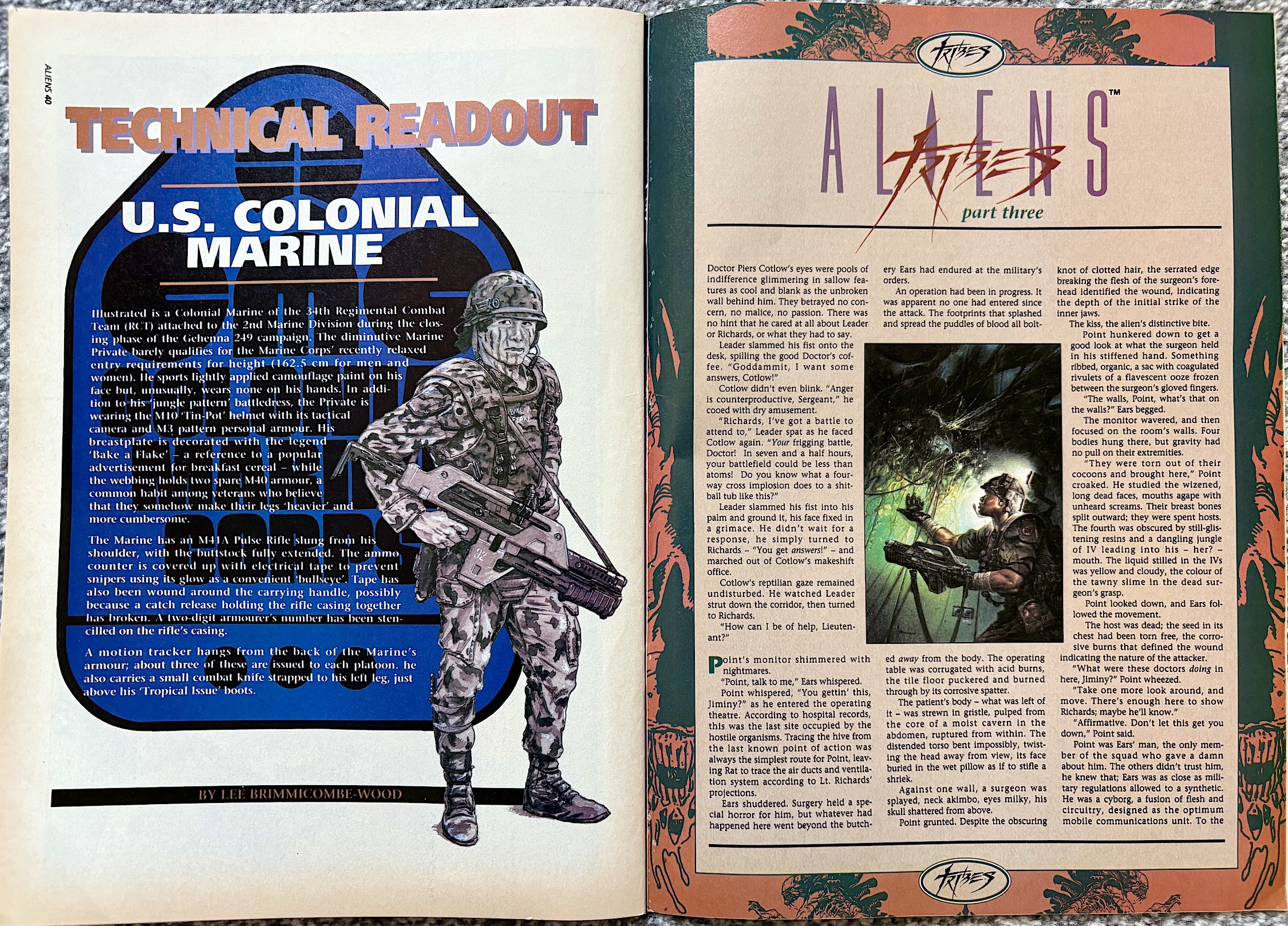 This small but still interesting cutaway of the Colonial Marines transport ship Sulaco from Aliens is part of a two-page introductory Technical Readout, the first in a series of features from the always-fascinating Lee Brimmicombe-Wood about the spacecraft. These should make for an interesting series over the coming months. Also coming next month is the final chapter of Alien Vs Predator II, so as previously promised I’ll talk more about that next time.