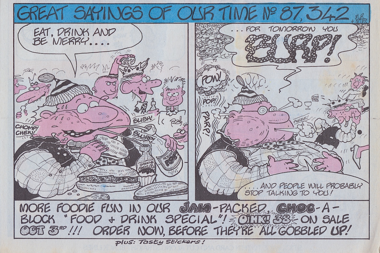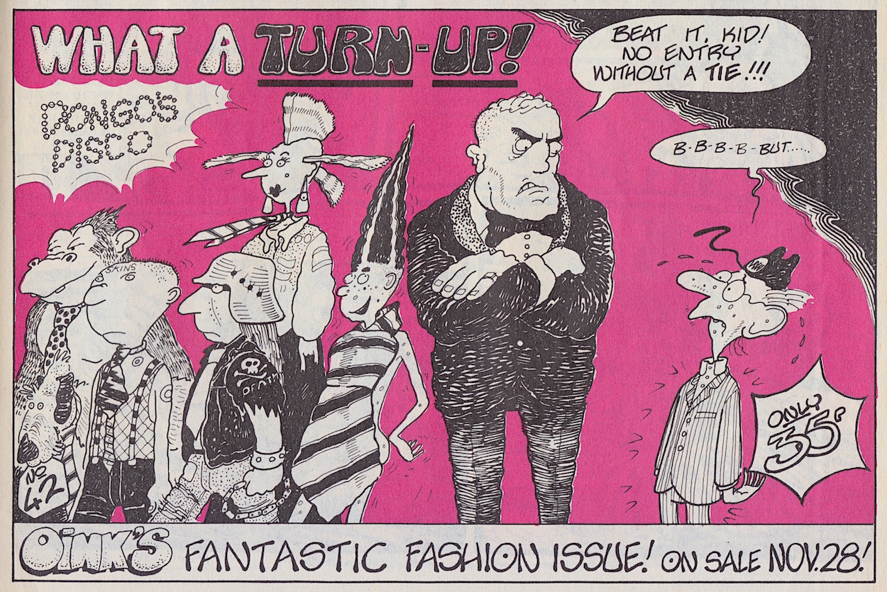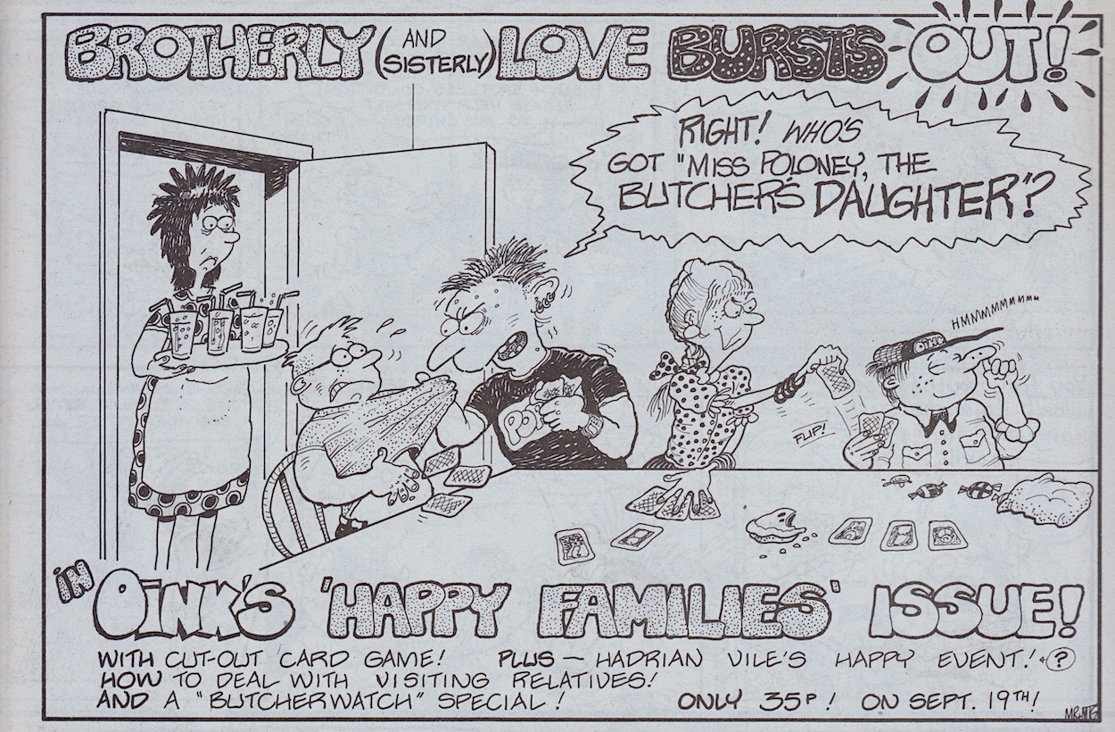 Back to the issue at trotter and Hieronymous Van Hellsong’s prequel begins with a few Beatles gags during the assassination that starts his adventure, and then Burp’s strip has surely one of the best names created for a comic. Lew decided to end his Pete and his Pimple strip with a random little image that, as you can see, had nothing at all to do with the page. However, according to Lew OiNK’s editors decided to have a little joke themselves and added that cheeky little arrow to it before publication!