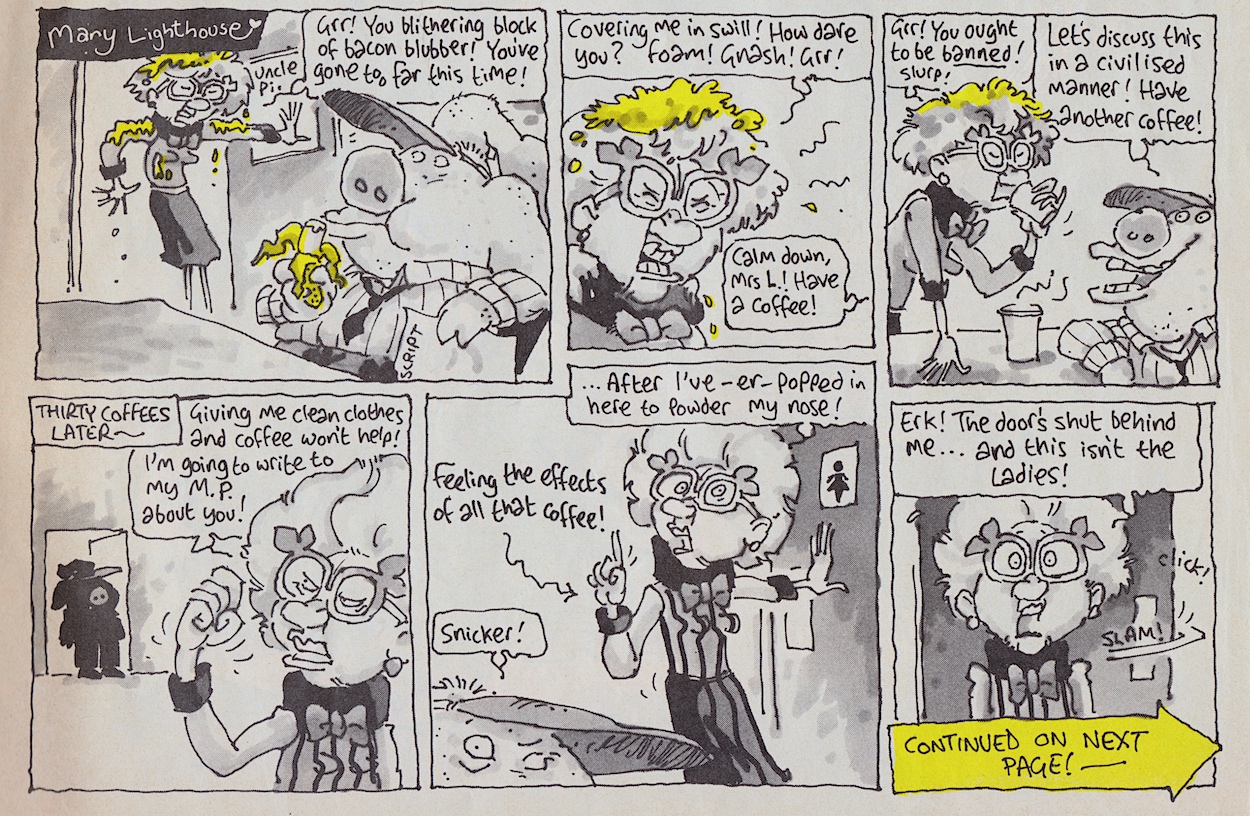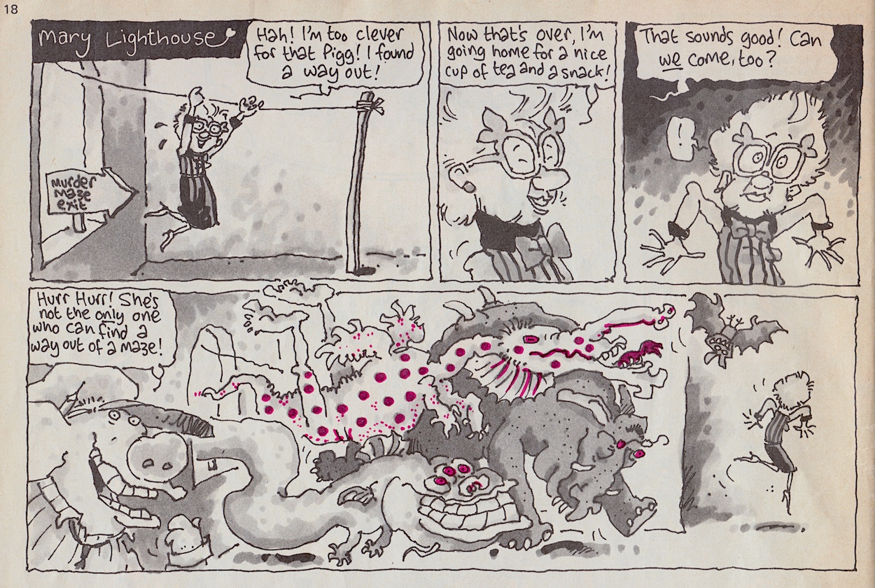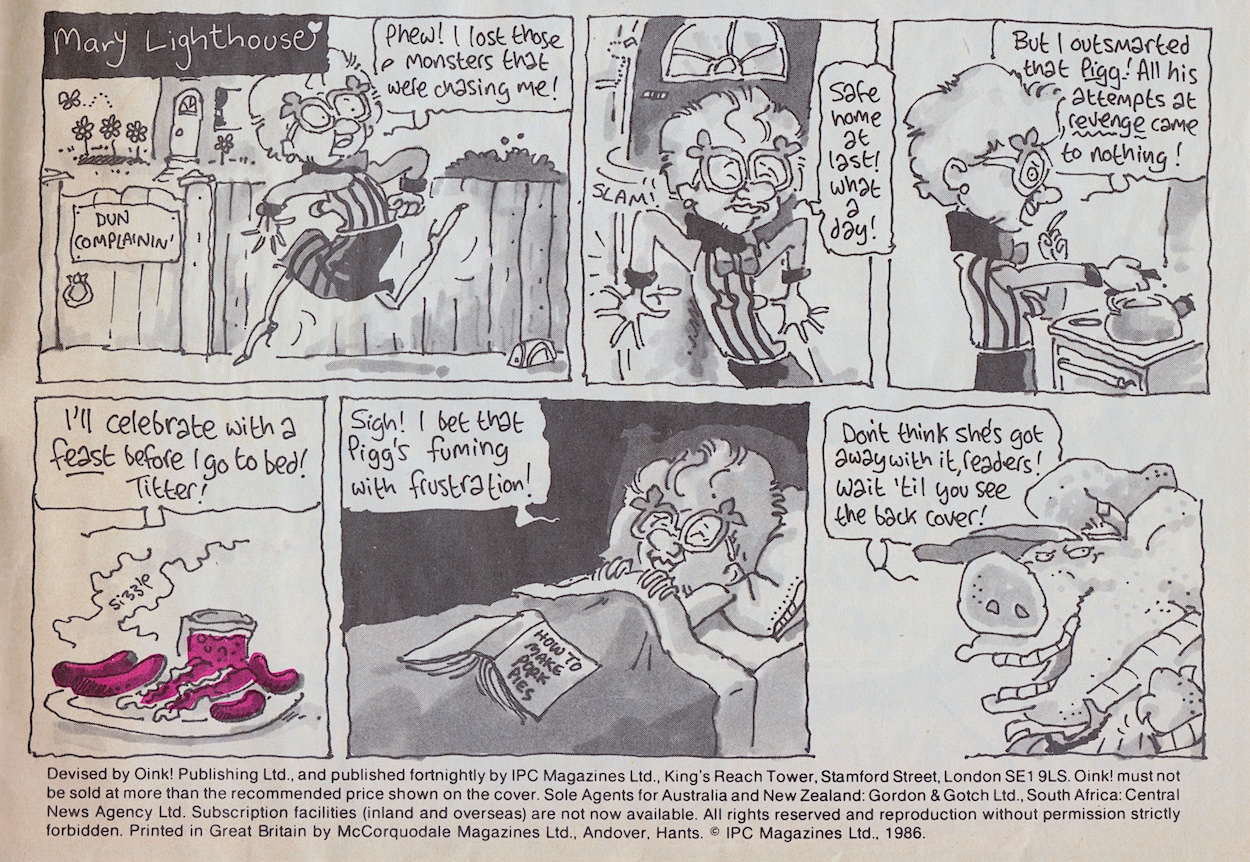 This one might look familiar to anyone who has purchased the new comic series from David in recent years because he reproduced this as a full colour strip for the cover of the first issue. In fact, between contributions to Aces Weekly and Psycho’s own comics, David has now produced more work for the little old dear in the years since OiNK than during her time in her debut comic.