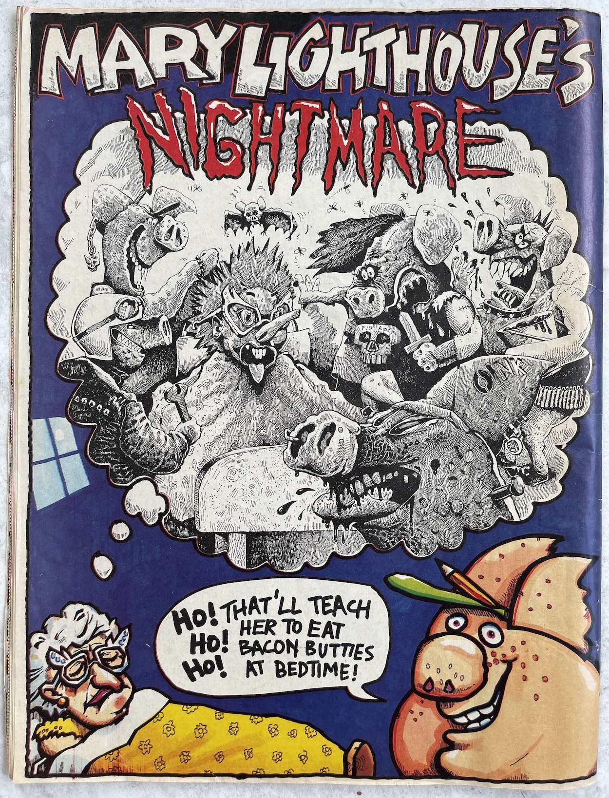 Created by David Leach (Brain Damage, Toxic Crusaders, Spongebob Squarepants) she was originally submitted as a one-off strip, so when OiNK’s editors introduced her as a new regular character in this issue it was a bit of a surprise for David. This explains why she doesn’t reappear until #21 because he hadn’t made any more! David tells me the guys would send him a list of upcoming issue subjects and he’d submit Psycho Gran strips for whichever ones he had an idea for. He never had a Psycho strip turned down and as a fan I can see why.