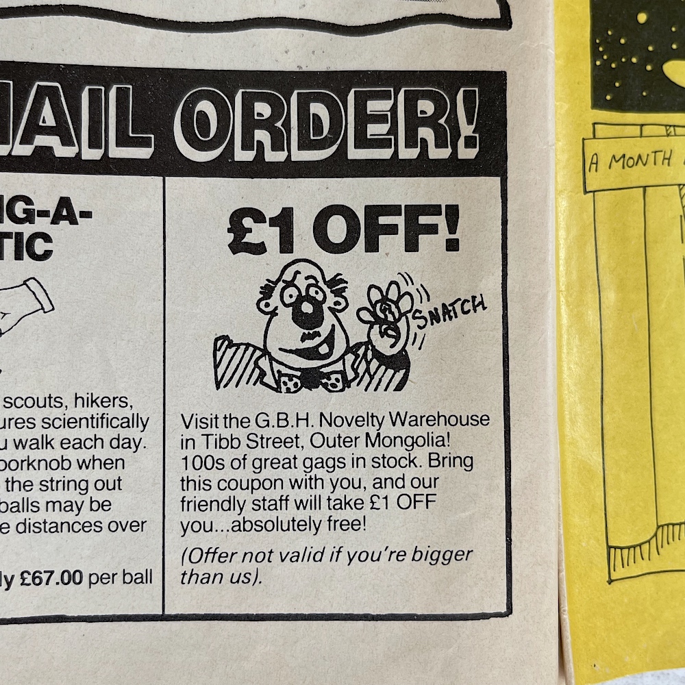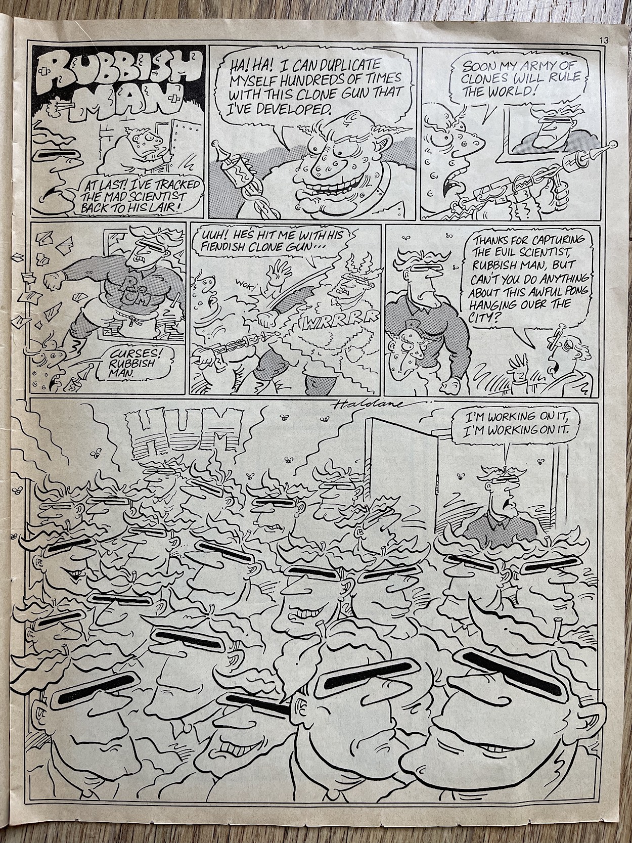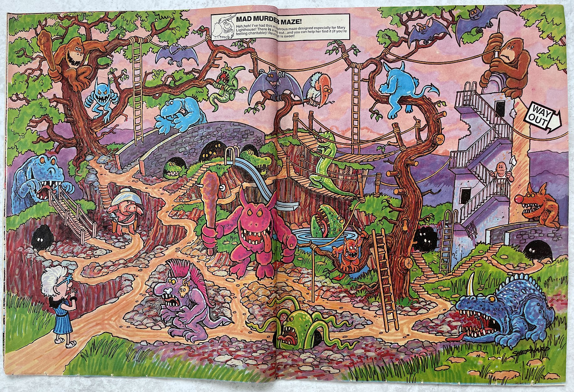 Let’s not forget the fantastic free gift, the first of three Ian Jackson posters which combined into one giant calendar for 1987 featuring The 8th Wonder of the World: Mount Rushboar. I can remember pouring over all the little details in the swarm of people running across Harry the Head and Burp the Smelly Alien carved into the rock face and even the little bits of rubbish left behind on this apparently reverential site. How typical of us humans and a funny swipe at British tourists in particular.