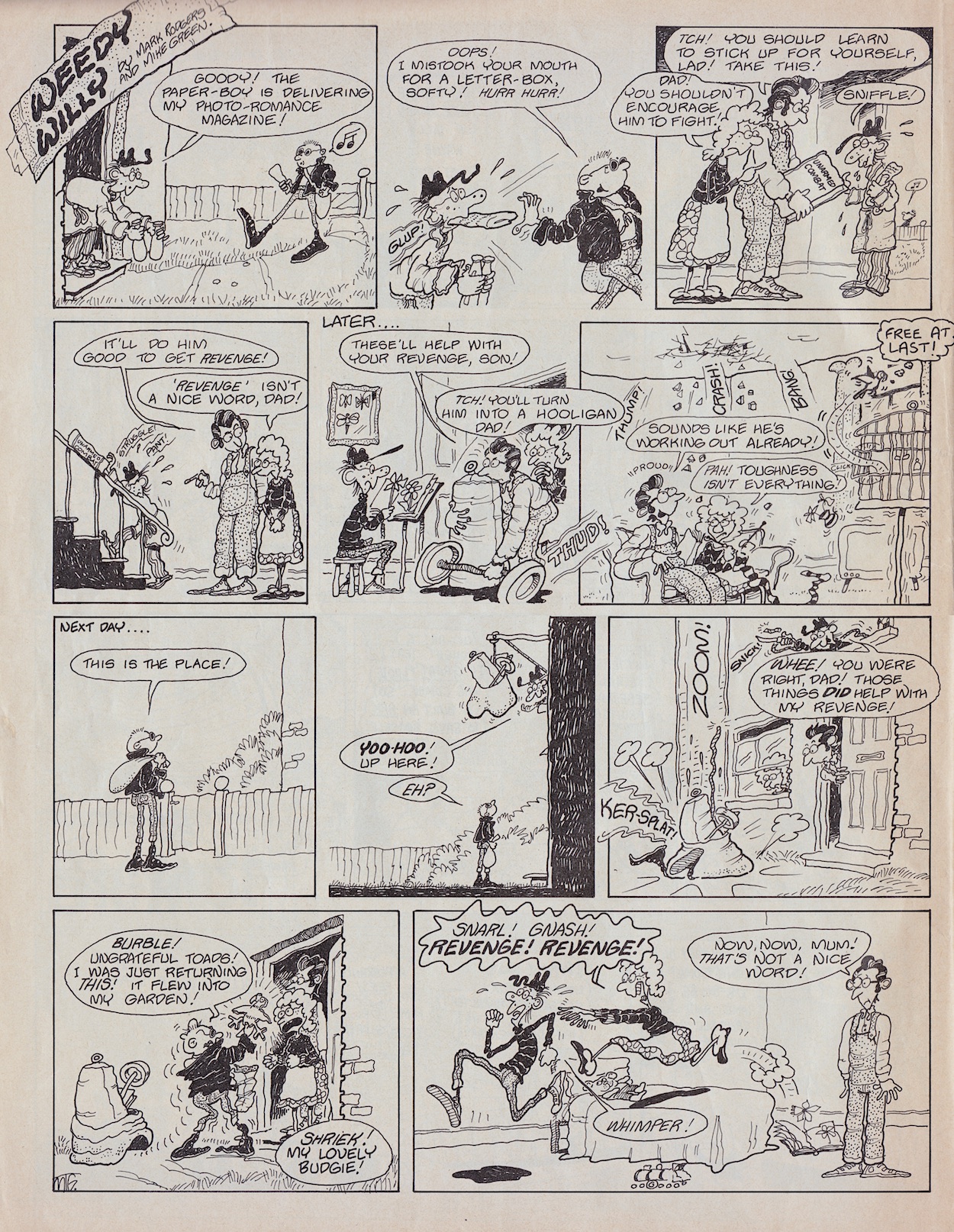 Two new characters are up on the next page together, namely Sally Scowl (Her Temper’s Foul!) and Fatty Farmer (He’s A Whole Lot Calmer). Their titles may have rhymed like so many traditional humour strips of the time but that’s where the similarities end. Both were written by Mark Rodgers (of course) and drawn by Dave Follows and Weedy Willy‘s Mike Green respectively.