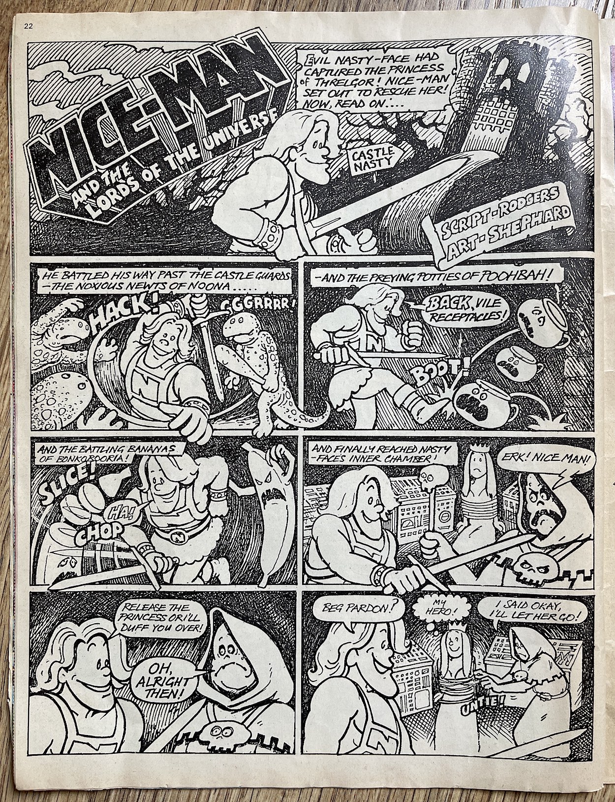 What a lovely surprise it was to come across this page when reading the issue for this review. Written by Mark Rodgers it’s already a funny script, but when it’s in the hands of Tom you just know there are going to be many more laughs added before he’s done with it. This would unfortunately be Tom’s final full page story for OiNK. After this his work would only pop up once more in a tiny quarter-page strip in The OiNK Book 1988, which I won’t be reviewing for another 13 months! Just as well this is so jam-packed with Tom’s trademark sight gags to keep us going. Tom was just too busy to be a regular contributor and that’s such a shame because I believe he and OiNK were the perfect fit, perhaps more so than any other comic he contributed to.