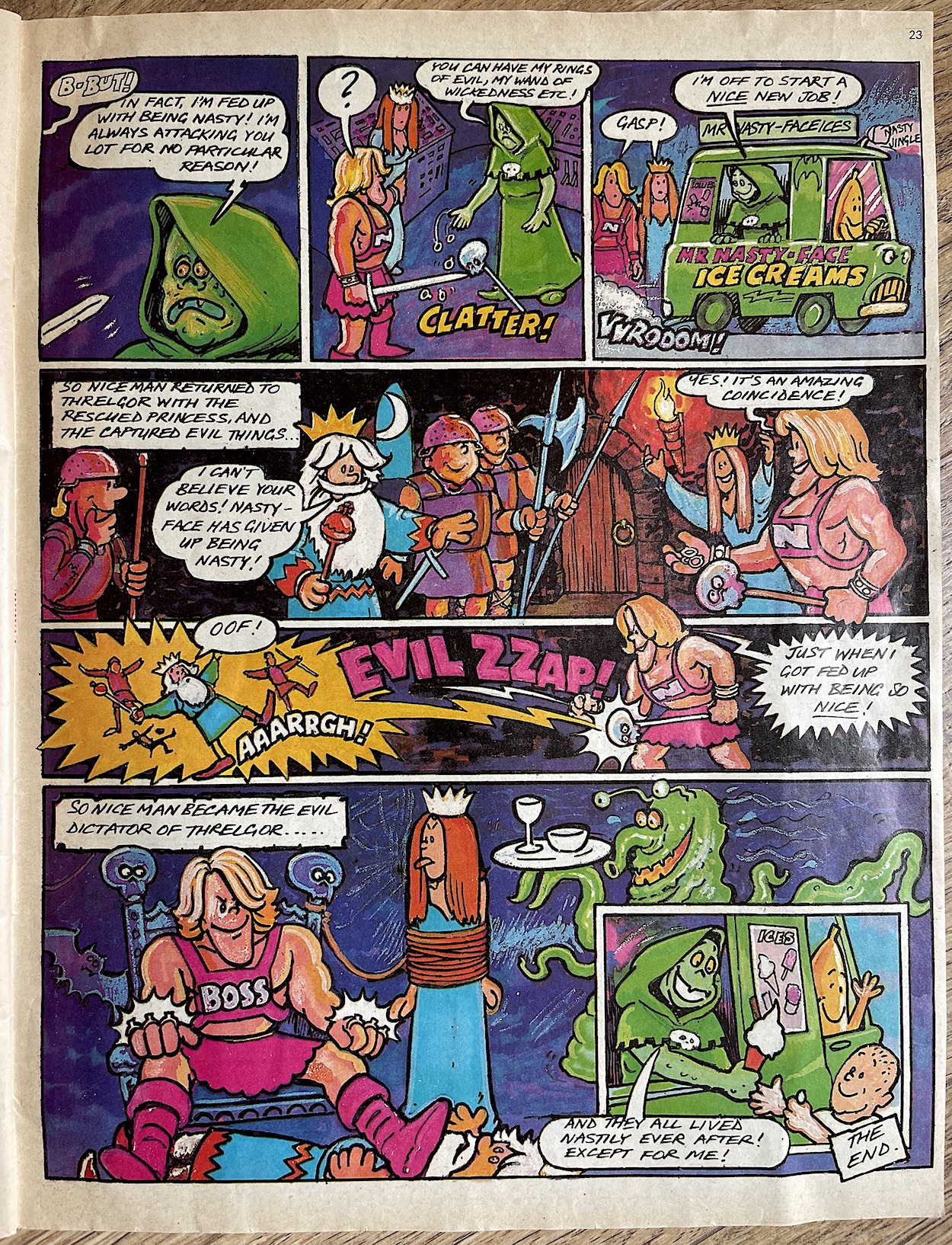 Fatty Farmer was a larger than life country man who’d often come up against bullies and small-minded individuals making fun of his weight. However, he’d remain chilled out and deal with them calmly, often proudly using the very thing they were laughing at to get his own back or to ignore them. The message was clear, don’t let the bullies get to you. He’d go on to be a bit more successful than Sally with 11 strips in total, appearing in every issue for the first few months and then on and off during the rest of the fortnightlies.