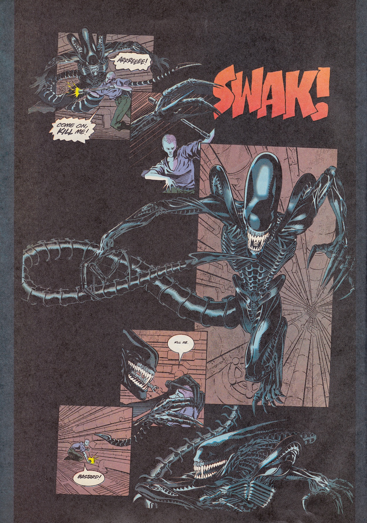 Meanwhile, the archbishop of the church appears to be the leader of a group of Christian fanatics. Seeing Beresford with a facehugger attached he simply tells the rest he’ll attend to it. Instead, he sneaks the body away and inside the tower presents him to an Alien Queen, albeit a very badly drawn one. While reciting the Lord’s Prayer the newborn alien bursts out of Bereford’s chest on a page the editorial described as “horrific”. If I didn’t know better I’d say Cefn was describing the apparently psychedelic art.