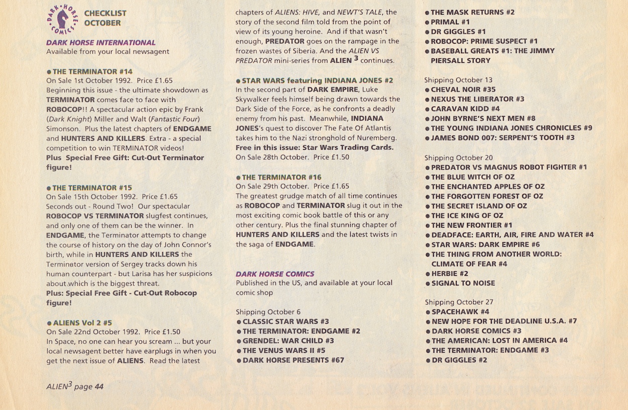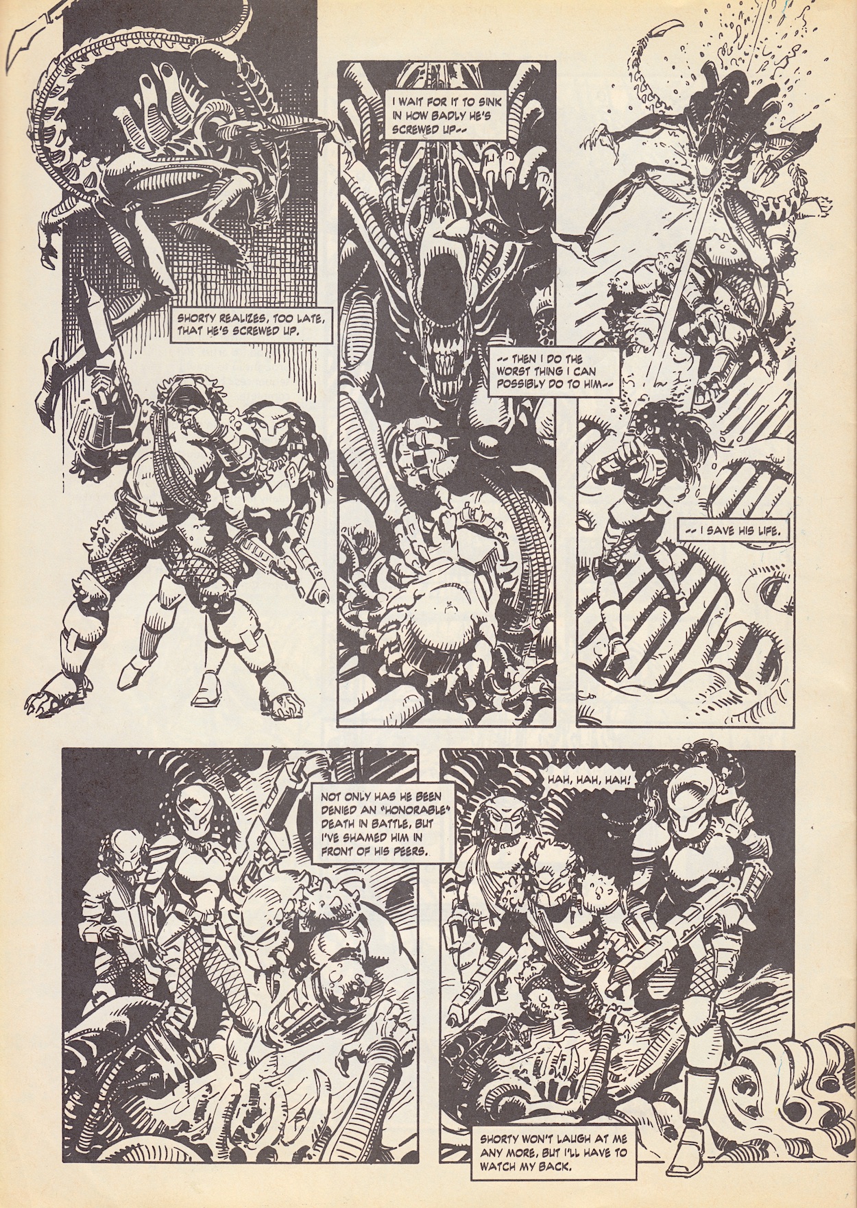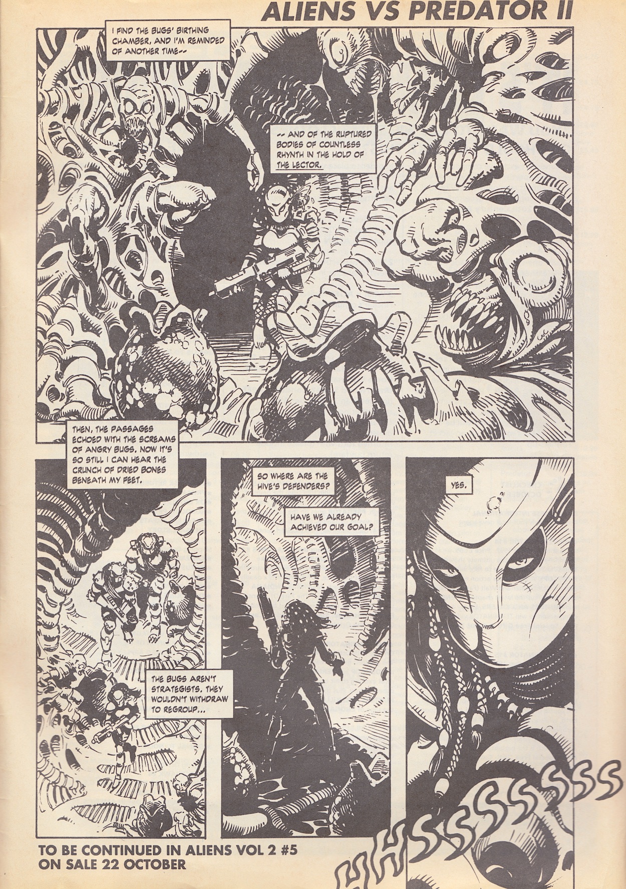 On the Motion Tracker news page we find out the toy competition from last month which required people to buy a handful of Dark Horse International comics is now going to be printed in full in Aliens. No reason is given but Star Wars had been cancelled after surprisingly poor sales. Then it’s on to eight pages of the “mind-blowing conclusion to Horror Show”, according to the cover. So, is it?