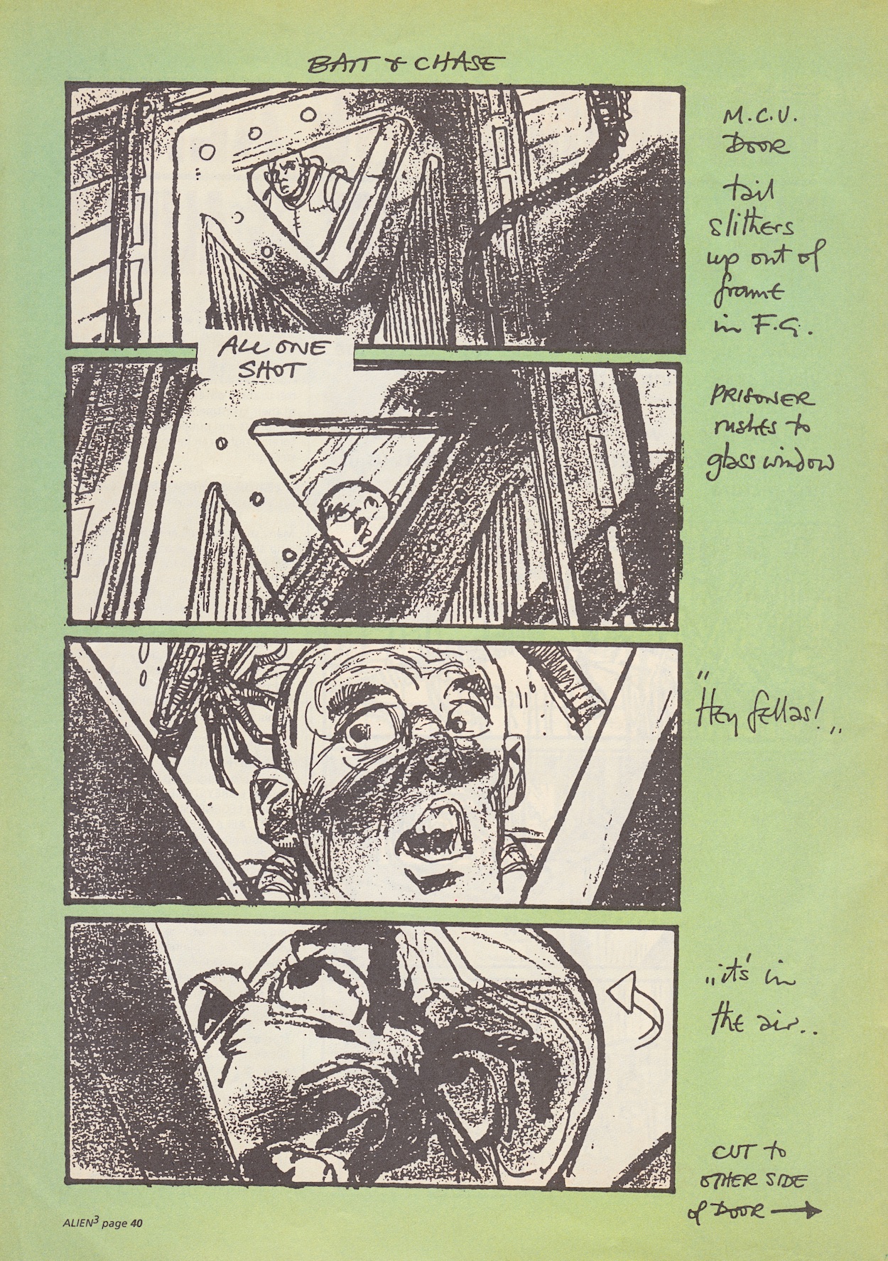 Unaware they’re being watched on camera by one of the humanoid aliens, this page shows the chaos of the suddenly escalating situation for the marines. It’s an all-action chapter that doesn’t move the plot forward but does see off quite a few of the peripheral characters in more and more horrific ways, not least of which is this accidental death when one marine is grabbed from above and fires their weapon in desperation. These small chunks are great fun every month.