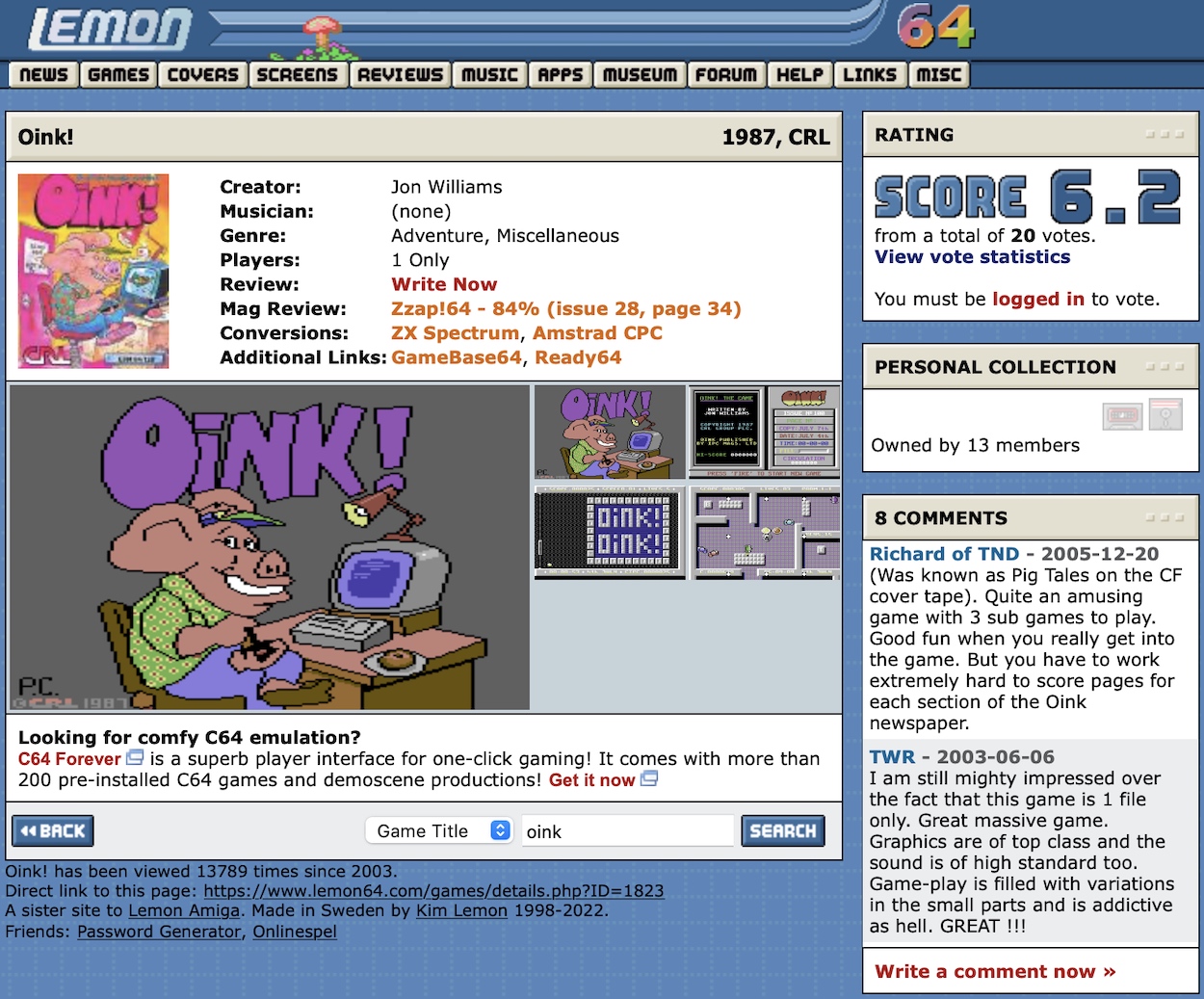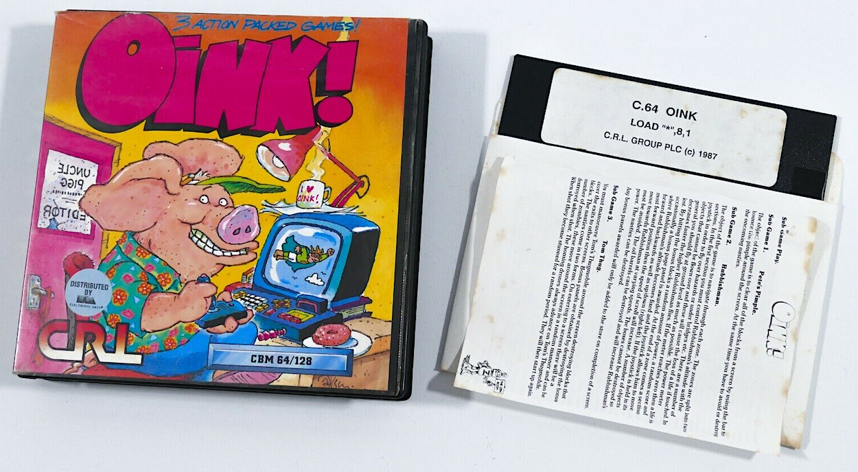 Like the OiNK game before it there was nothing too original then, but what was there was fun. A quick glance at a “64%” score and it’d be easy to dismiss it, but reading Stuart Campbell’s review has me thinking it may have got a higher score upon rerelease. I can find no evidence of a further CF review, however Zzap!64 scored it 52% initially but this jumped to 74% after its price drop. Nothing to write home about then, but an interesting look into a curious OiNK-adjacent piece of merchandise nonetheless.