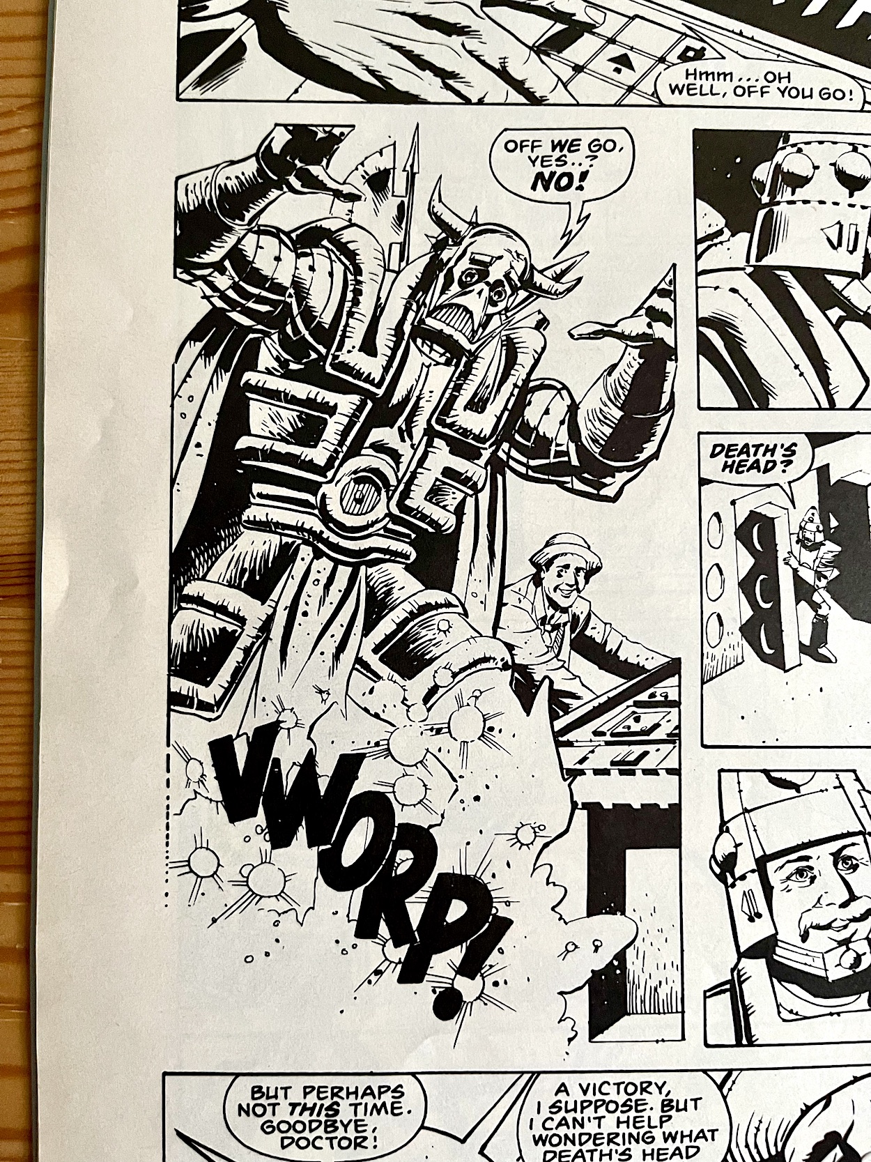 It was actually seen in one of the more recent series when my own personal favourite Doc, Jodie Whittaker’s take on the character, went up against Sacha Dhawan’s highly memorable Master. In it he used the compressor to kill quite a few people in a particularly nasty fashion. Indeed, back in our strip the Doctor acknowledges it’s a horrible device but that “desperate situations call for desperate measures”. But the fact Death’s Head is already so huge has an unexpected result.