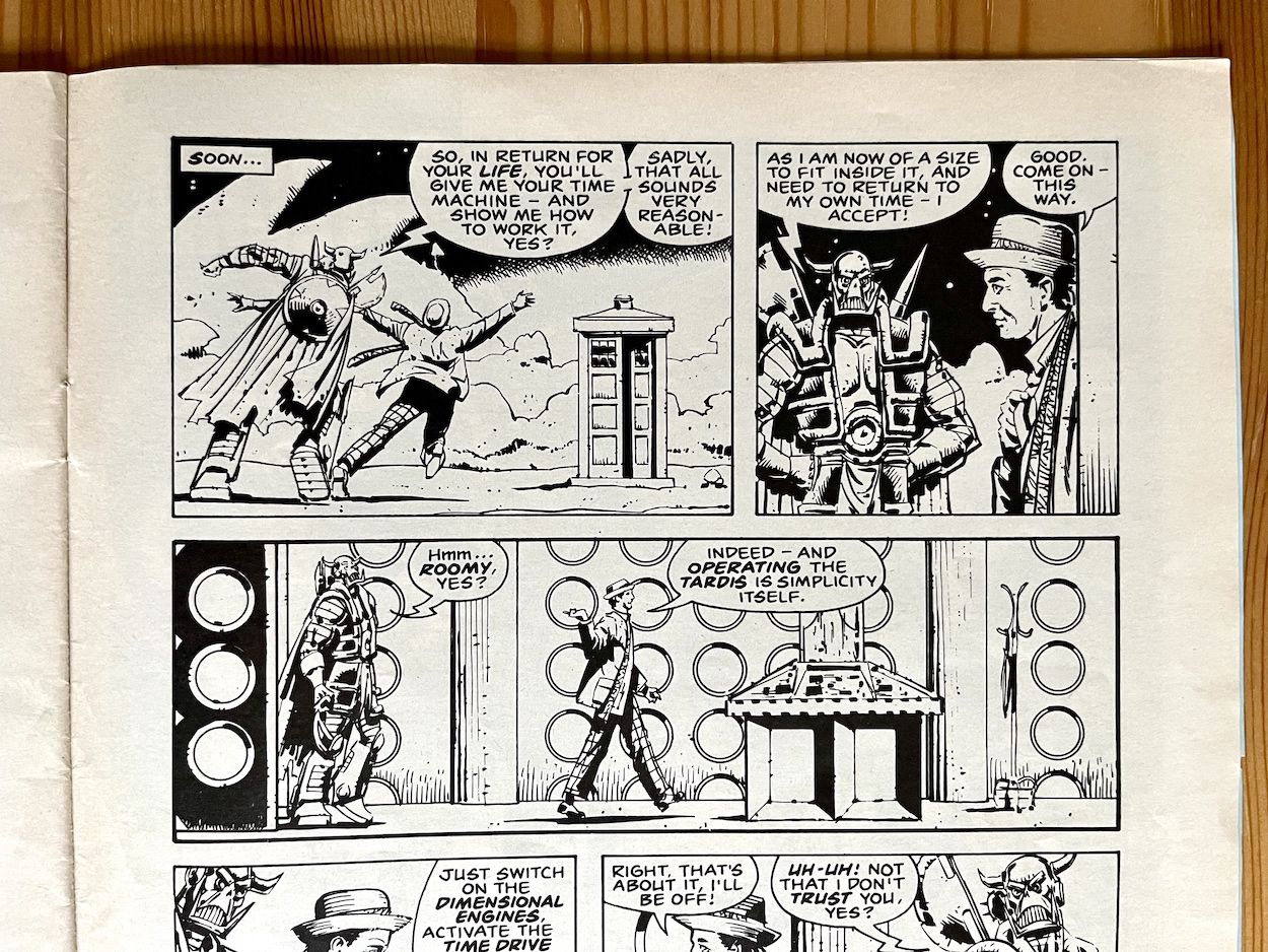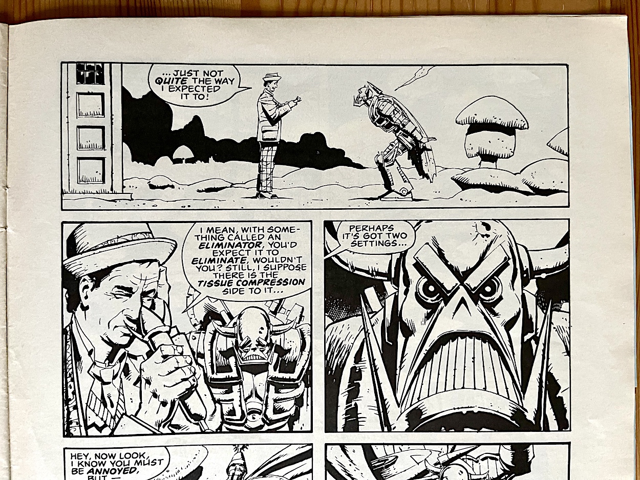 When this edition of Doctor Who Magazine hit newsstands I hadn’t even watched a single episode yet! It wouldn’t be long before I was a fan though and today I most certainly am, but I’ll get to that at the end of this post when I point something out in the news column of the issue. That’s not why we’re here though. We’re here for the comic strip starring a certain Freelance Peace-Keeping Agent, yes?