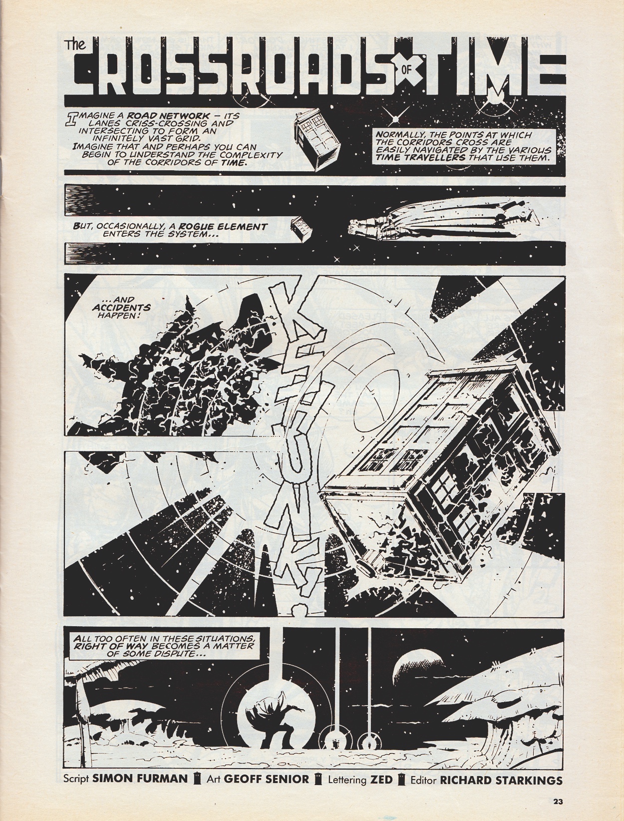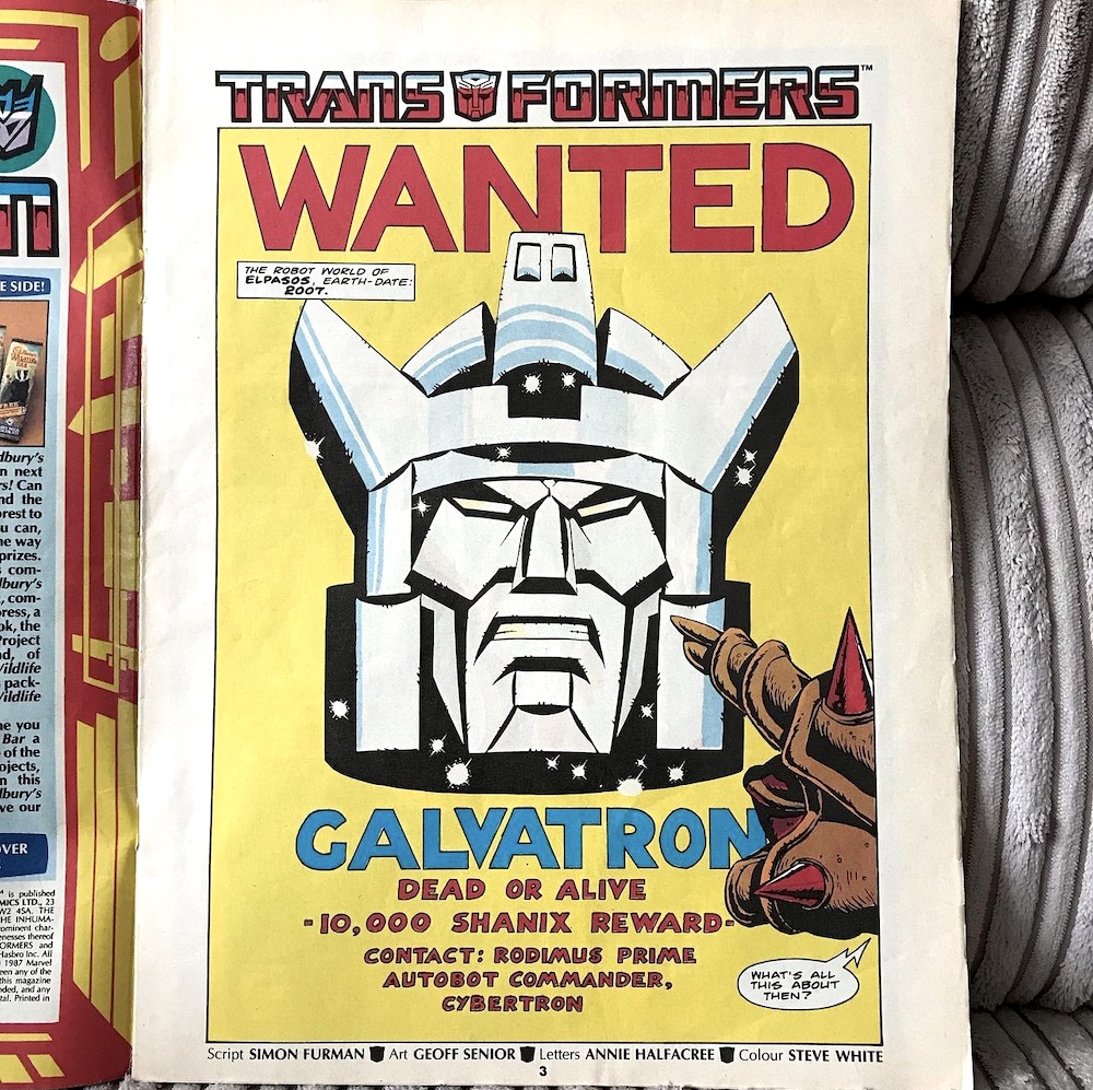 Written by Simon Furman and drawn by Geoff Senior with letters by Zed and edited by Richard Starkings (actually Zed is Richard), The Crossroads of Time was a one-off eight-page strip in #135 of DWM (which is at #588 at the time of writing). The magazine was a very different publication back then, with 36 pages and only the covers and middle four in colour (as opposed to the 84 full-colour pages it has today, complete with regular Lew Stringer Daft Dimension strip), but just like the best of the black and white stories in later issues of Transformers I think this really highlights Geoff’s inks and gorgeous details, some of which are very funny.