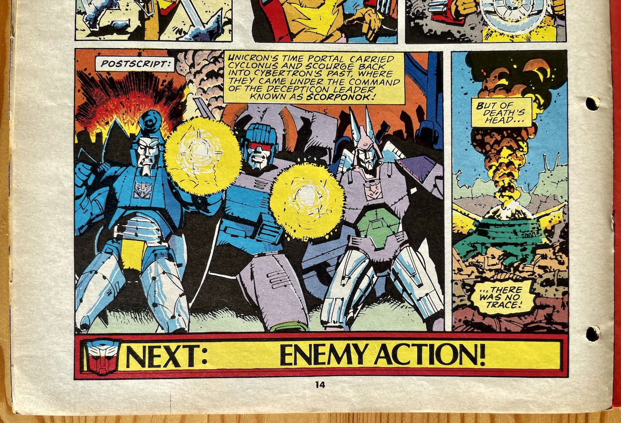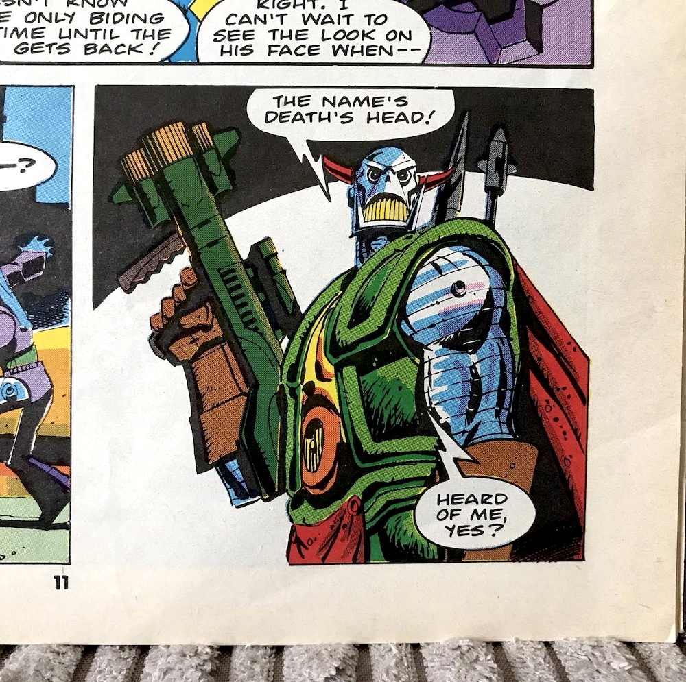 The last anyone saw of Death’s Head was when he disappeared through an exploding time portal in the pages of Transformers #151. While we saw the others he shoved through the portal survive the implication was clear he was missing rather than dead and readers eagerly awaited a surprise return at some point. That inevitable return was only two months later, but what was even more surprising was where it happened: in a different publication.