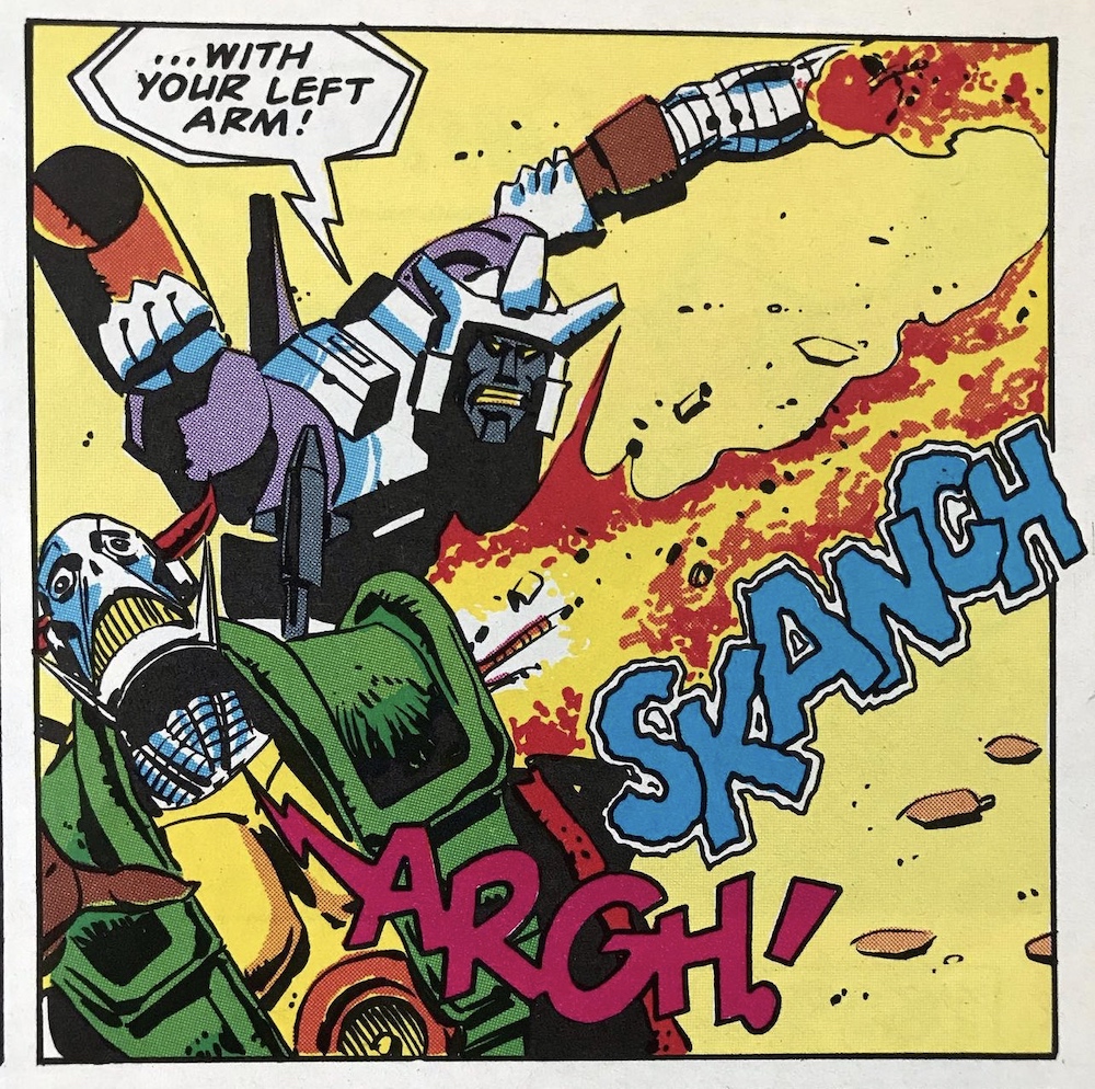 The Doctor successfully bluffs his foe into his own fate by quickly running through some technobabble by means of instructions on how to time travel (remember, Death’s Head wasn’t a time traveller, he used others’ tech to do so in Transfomers), before pretending to leave it in the hands of its new owner. Death’s Head stops him, convinced if he did as instructed it would turn out to be a trap and tells him they’ll travel together for the first trip. Of course, this is what the Doctor planned all along and he sets the controls for Earth in the year 8162, concentrating the time circuits on the mechanoid who dematerialises accompanied by the text of that famous sound effect.