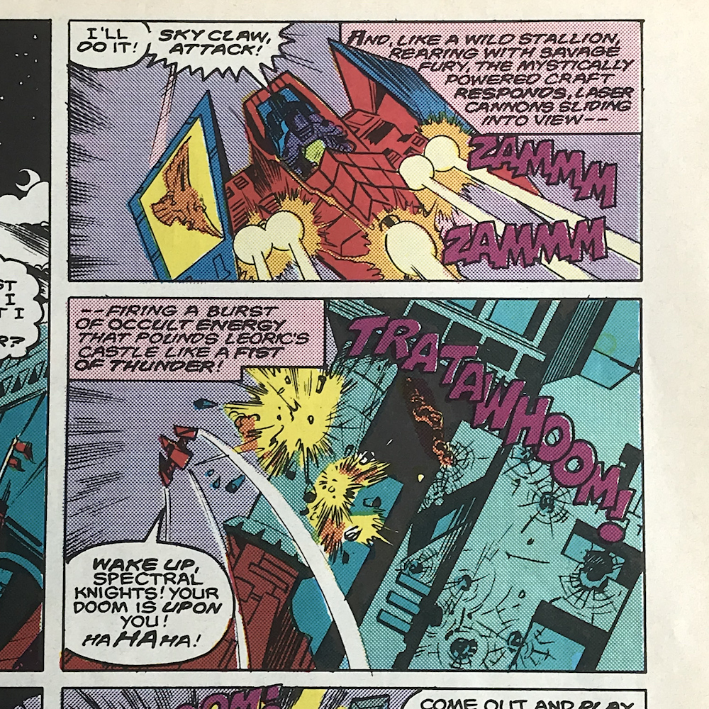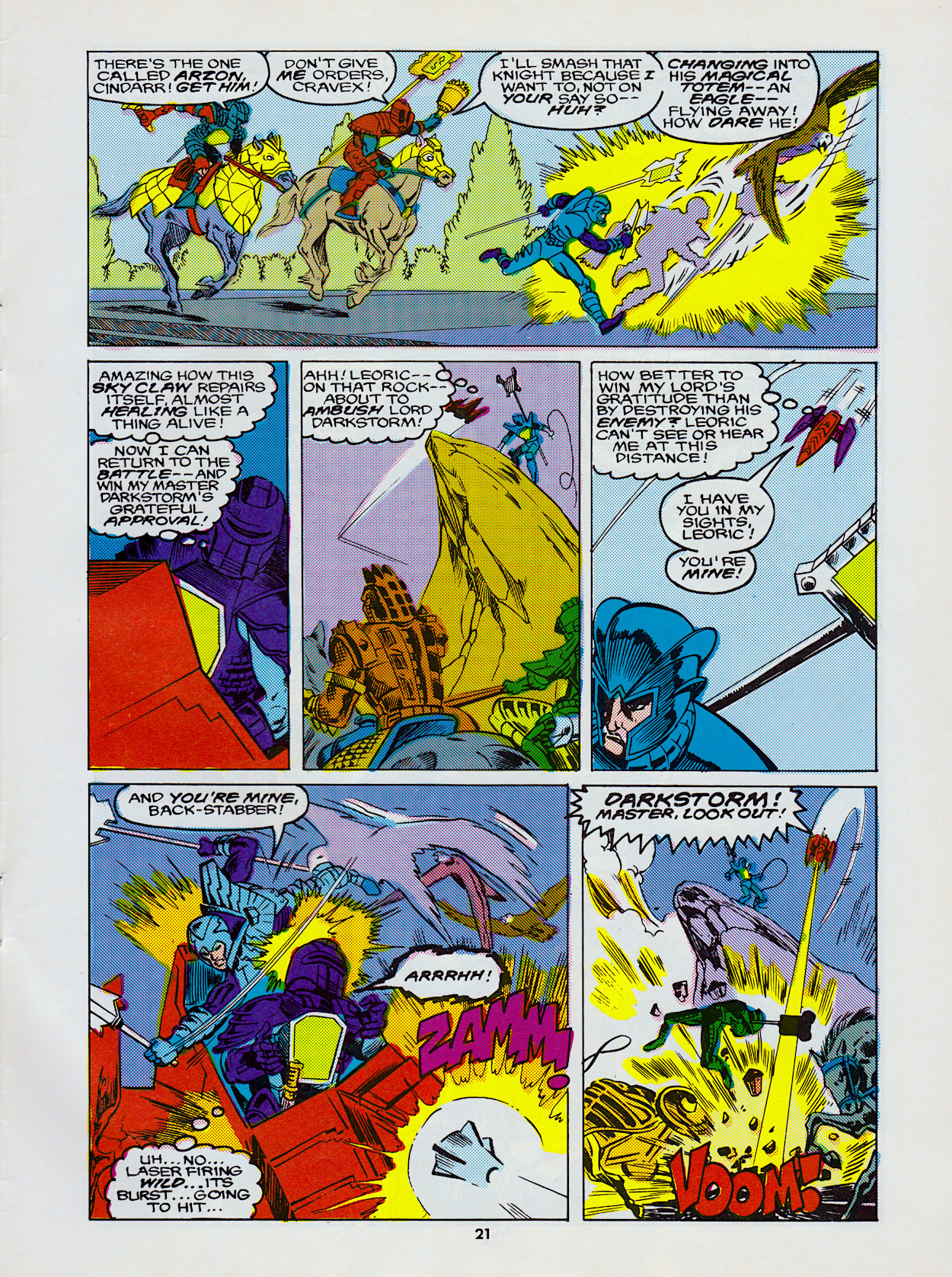 Something else this issue has in plentiful supply is action. As soon as Merklynn finishes his prophetic speech the Knights turn on each other, wishing to finish off the battles started inside Iron Mountain. Galadria gets the best line, then some of the characters start hearing a voice inside their head, telling them of incantations to summon the power of their magical staffs. Reading these again brings back memories of learning them off-by-heart from the toy packaging.