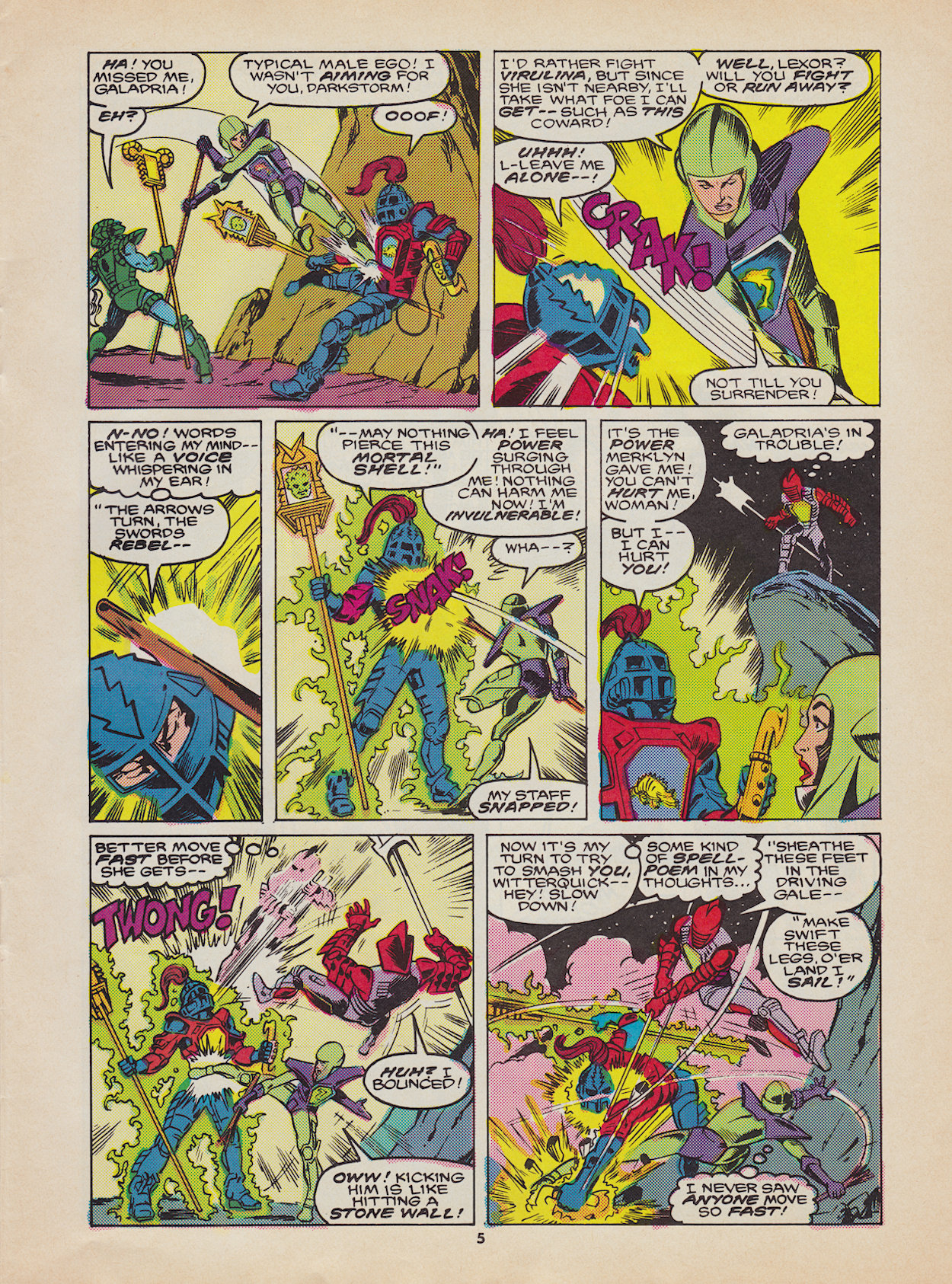 In a moment of desperation against ever decreasing odds Darkstorm uses his staff’s Power of Decay to try to destroy all of the Spectral Knights in one swift move and it’s Galadria who saves the day, throwing herself into its path. She may not have her own powers yet, but here she shows her willingness to sacrifice herself to save others. This sets her up to receive her Power of Healing from Merklynn. See also how cowardly Lexor now throws himself into battle, but only because his Spell of Invulnerability can stop anything in its tracks.