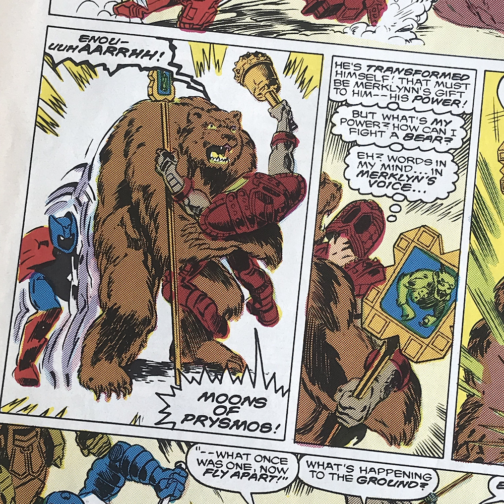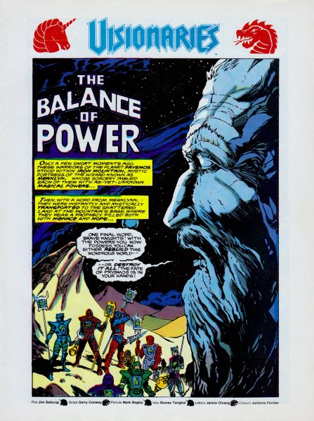 Next to the editorial the first page of Balance of Power is a bold image. On it, Merklynn‘s stone face stares down at the assembled Knights and reiterates the words from the end of last month’s story. Jim Salicrup, who adapted Frank Dille‘s teleplay origin story has created the plot this time around but full scripting duties fall to Gerry Conway (The Punisher, Spider-Man, Transformers and G.I. Joe cartoons, Diagnosis Murder) who would take over as the comic’s sole writer from the next issue.