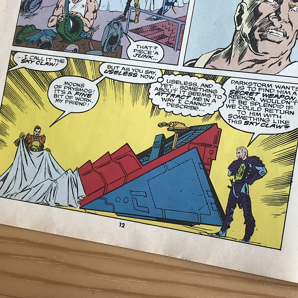 It kicks off with plenty of action as Reekon‘s new Dagger Assault, the biggest and best of all the toys in the range, tries to eliminate the Darkling Lords‘ contractor Harkon to stop him supplying any magical vehicles to the Spectral Knights. Reekon also goes up against the Sky Claw which is still in the hands of their enemy, but its owner Mortdredd recaptures it this issue, sneaking into Leoric’s castle in beetle form to steal it back. This act also introduces one of the changes from the cartoon that I actually prefer.