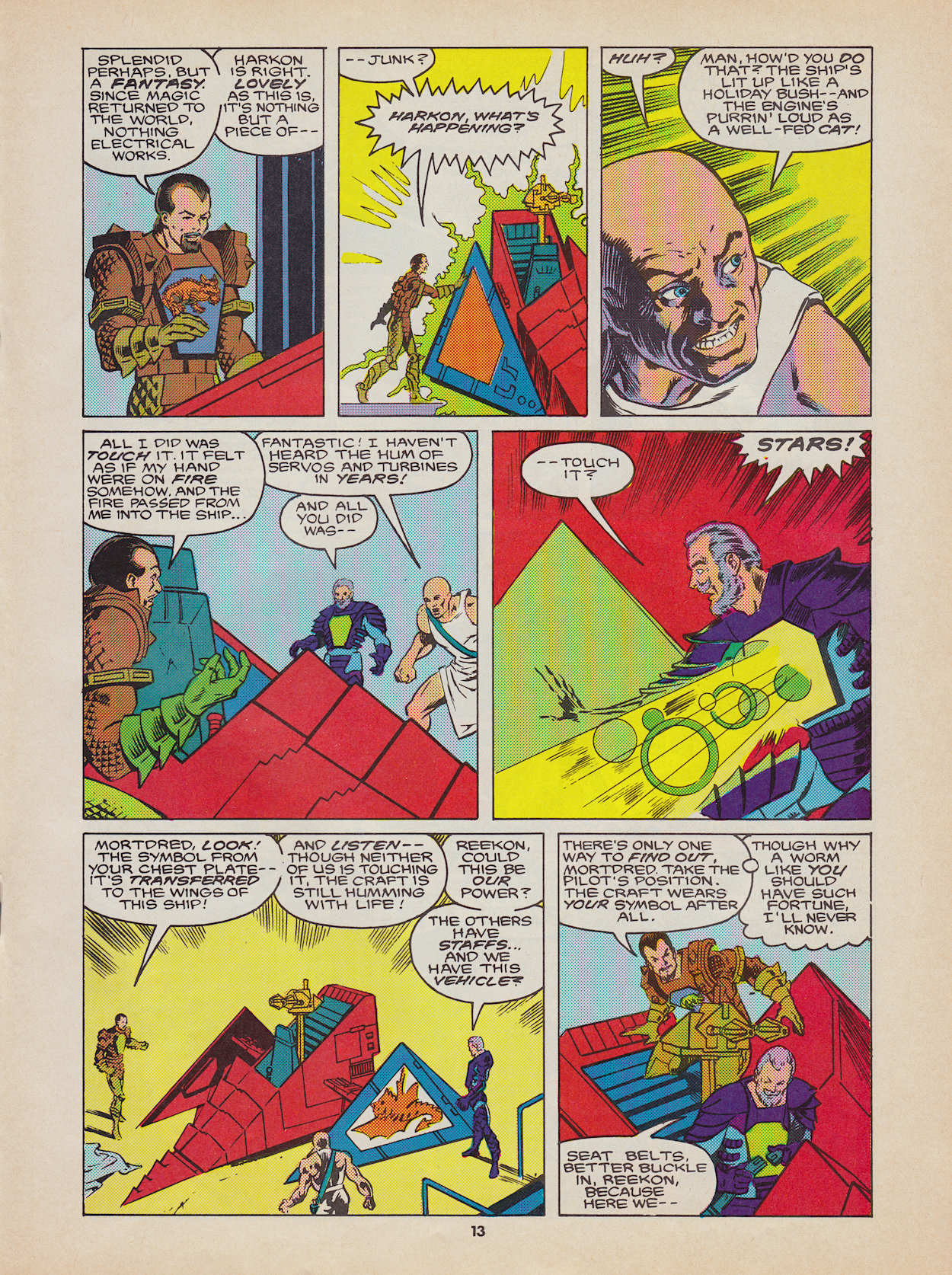 The machine responds to the energy of Reekon’s magical touch, but it’s Mortdredd’s proximity that really brings it to life. While the statement that the symbol from his chest plate transferred to the craft is completely wrong, it’s still a fun way of introducing it. I particularly like how magical powers erupt from Mortredd’s chest, while his hand almost disappears into the holographic panel, becoming nearly skeletal-like. Although, why does Harkon say he hasn’t heard the sounds of an engine in years when this follows on directly from the previous origin story?