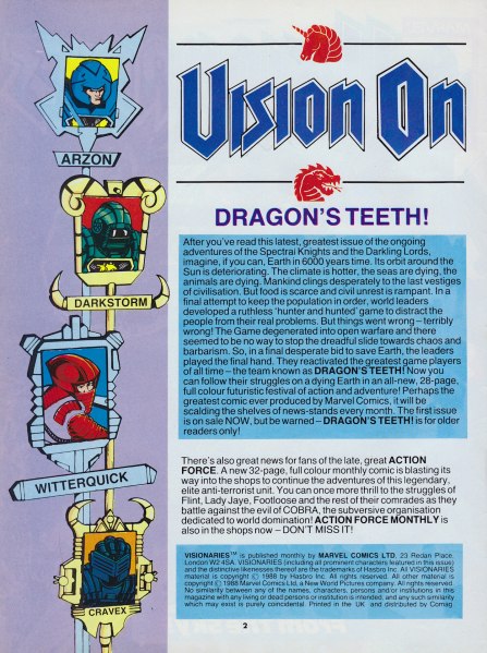 This wasn’t quite the end though. Making up a kind of action trilogy for Christmas that year was The Transformers Annual, The Action Force Annual and excitingly The Visionaries Annual. Plugged on the editorial page of #190 as the “first Visionaries Annual” it would also be their last. Plus, if you actually read the promo below you’ll see it’s not all good news because the strip stories would be very familiar to fans of the comic.