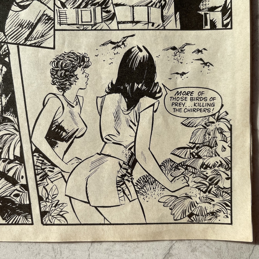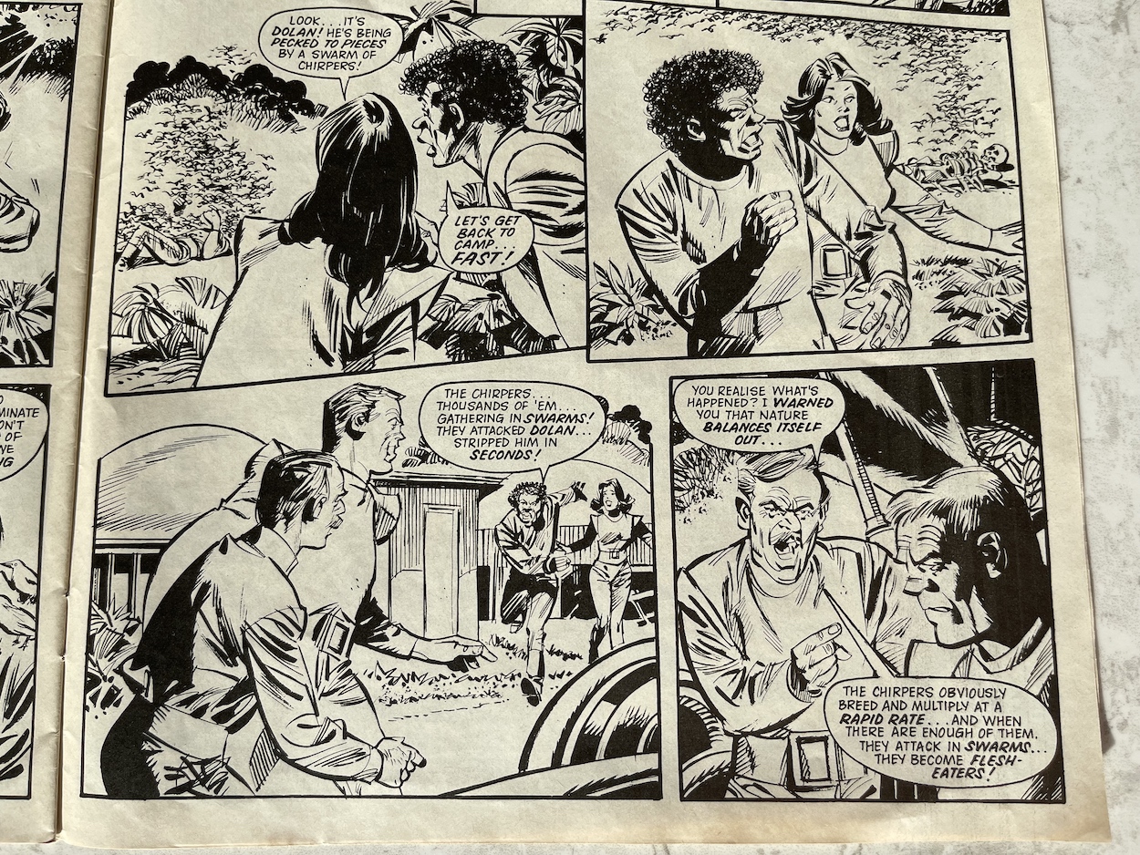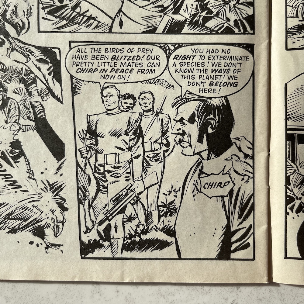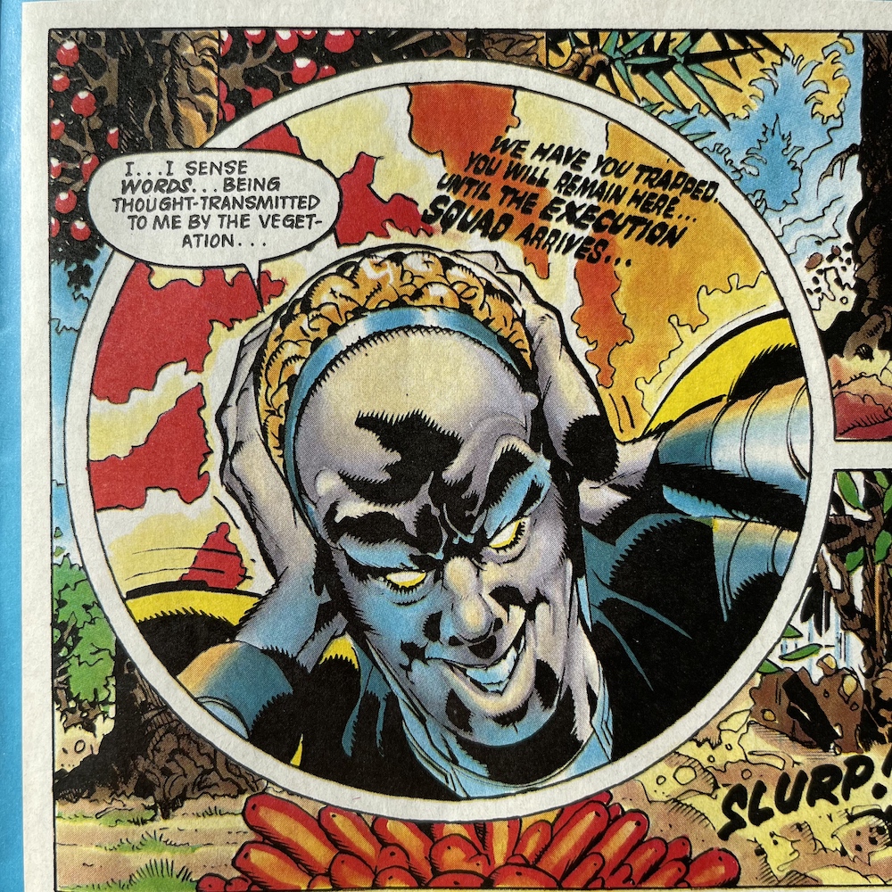 The second half of the issue has a full colour Joe Alien story split up into little two-page pieces just like The Games. While David Robinson‘s story isn’t technically a reused one, it does set itself neatly into the serial from the fortnightly, seeing as how Joe and his team were captured by the alien plant life on more than one occasion. Basically, they get captured again, Joe’s brain becomes disconnected again, then they escape again. But I find it strangely enjoyable.