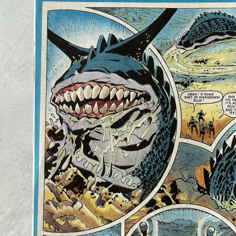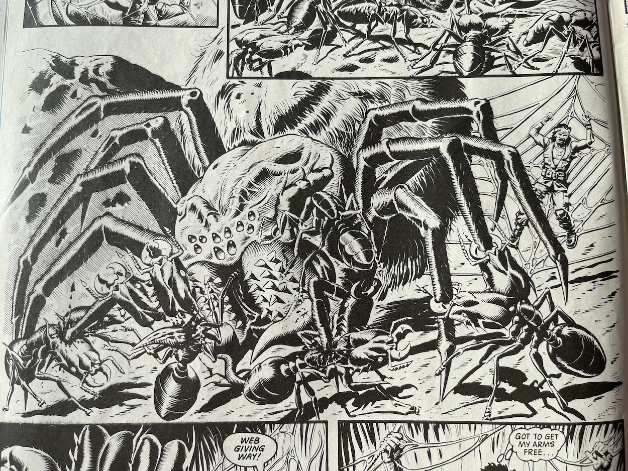 Oh come on now, this is getting a bit ridiculous. While it’s wonderful to see David’s art again and there are some genuinely funny moments, such as Loner cursing the fact his first reaction to new alien beings often lands him in trouble and the quip above about arm to arm combat, the fact the same plot has been used for two of his stories in a row (and now two strips in this special) is a real disappointment. It takes the edge off seeing him back in strip form. But that art is wonderful, especially when the big bad looks this good.