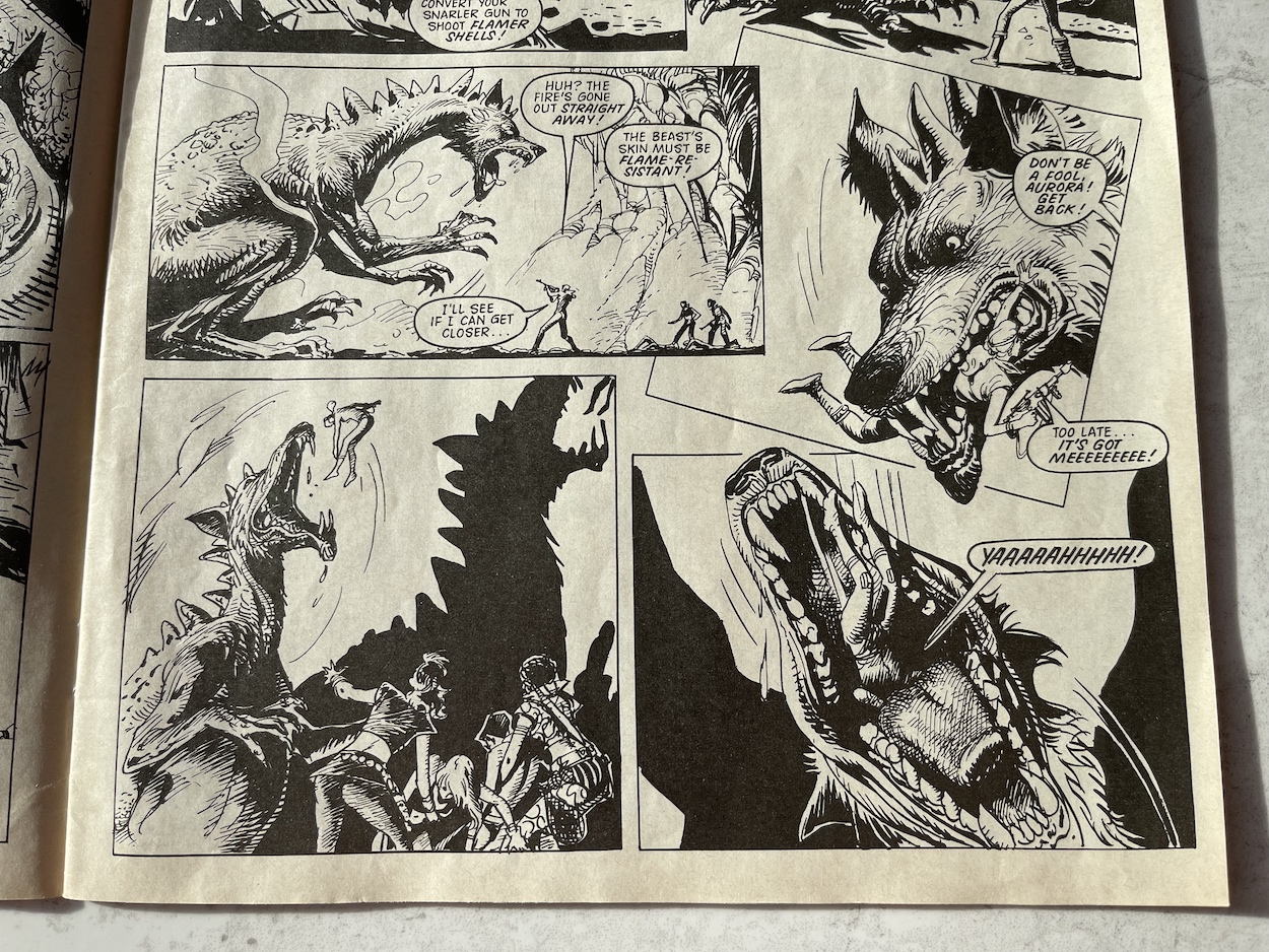 In Kitten’s regular story she and her teammates would come up against a never ending array of imaginative alien creatures, each one displaying some kind of innovative ability that they’d have to outthink on the fly in order to survive. From monsters with heads for hands, to gigantic leviathans with multi-headed pet dogs and beasts with see-through stomachs. The Kitten Magee strip also had strong ongoing stories and mysterious character arcs, however a big part of the fun was seeing what kind of monster would be thought up next.
